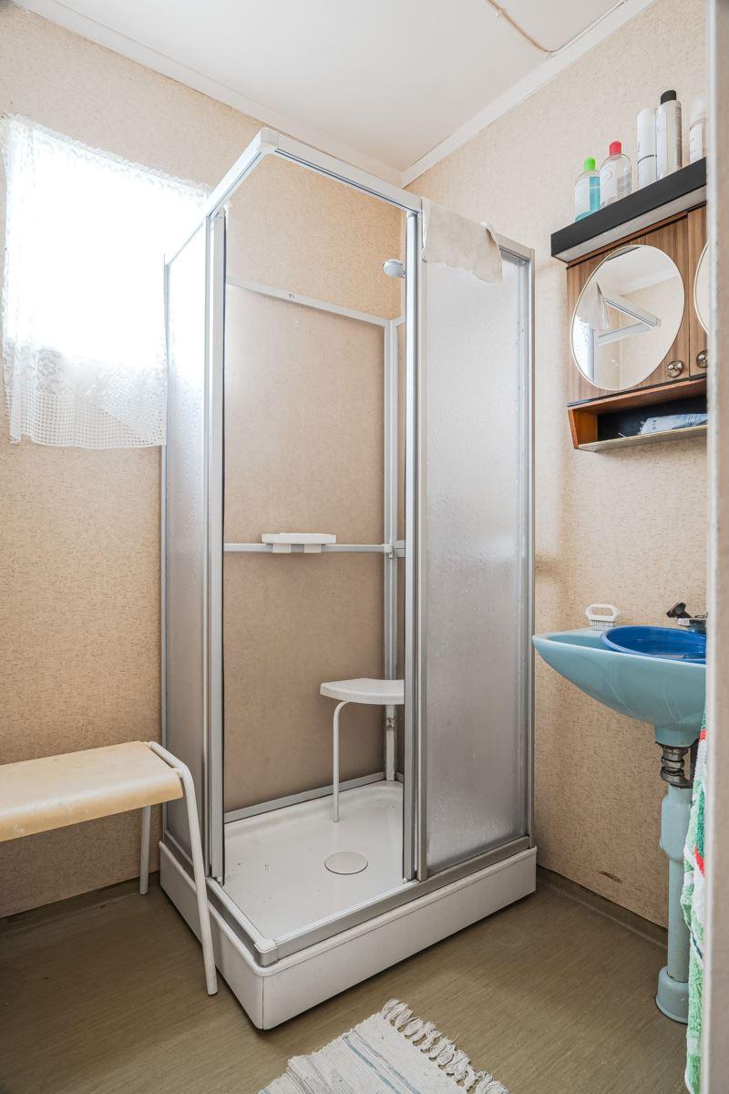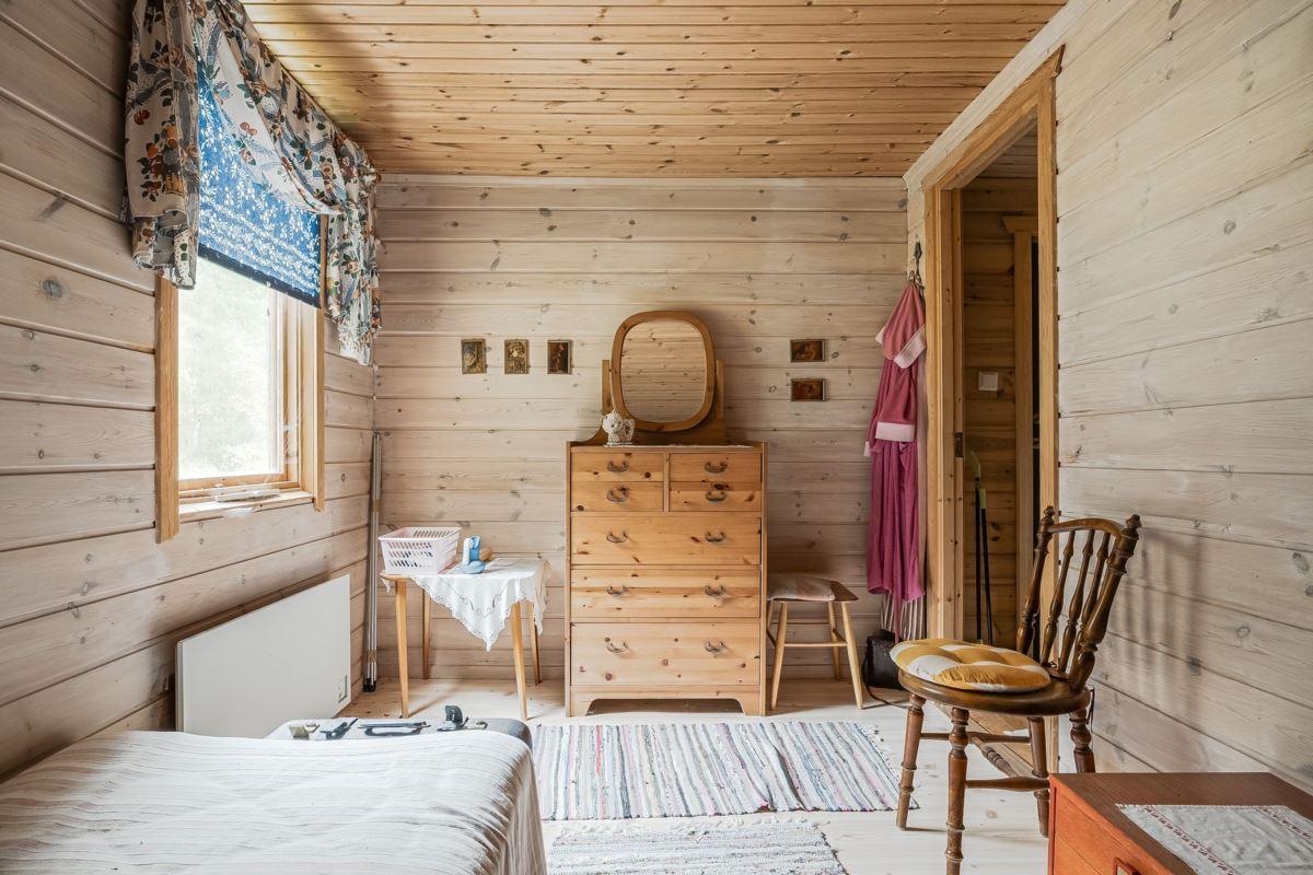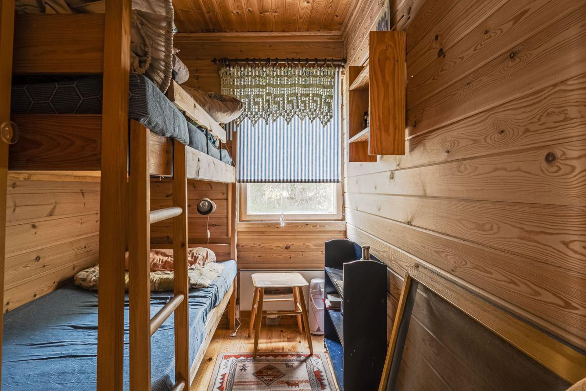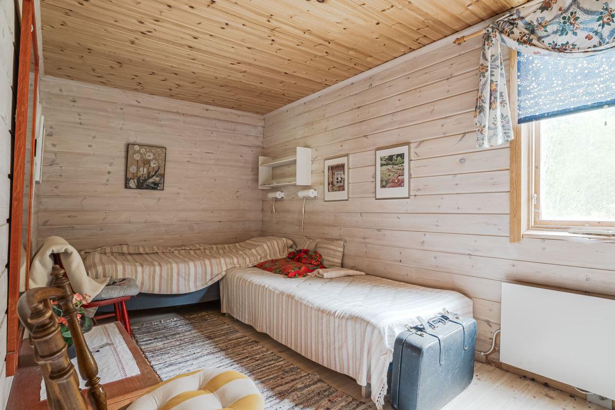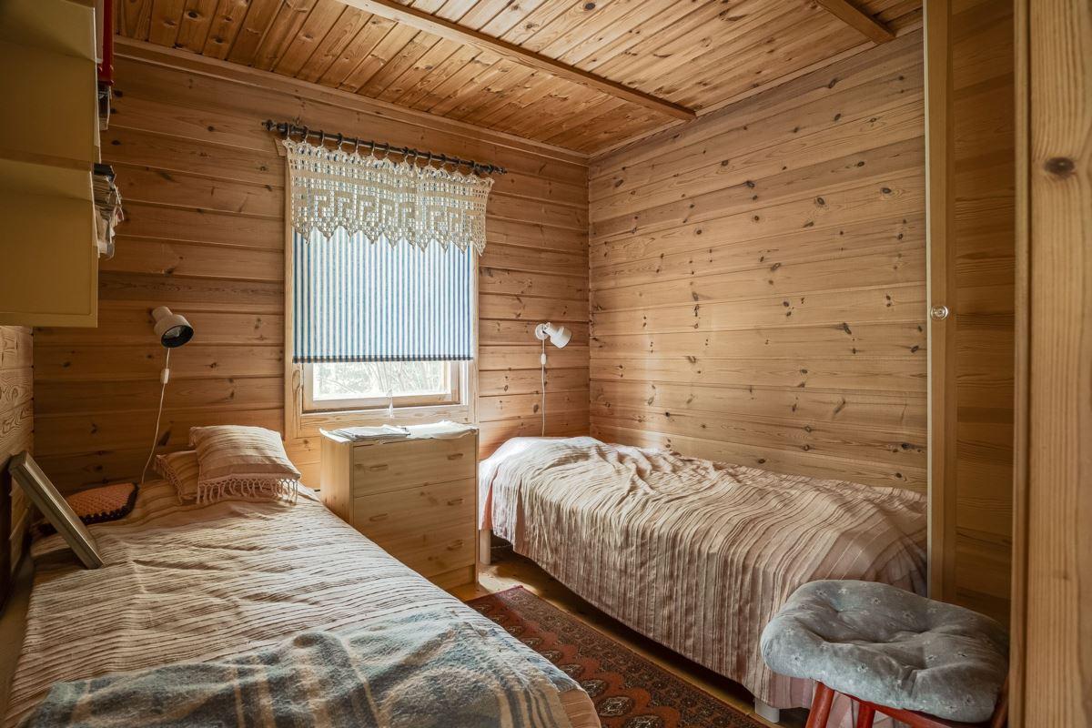 Direkt till vänster från hallen hittar du sovrum med våningssäng, trägolv och träpanel på vägg. Vidare genom hallen ligger ytterligare sovrum med plats för dubbelsäng, trägolv och träpanel på vägg. Genom nästa dörr från hallen kommer du in till duschrummet utrustat med toalett, dusch och tvättställ, plastmatta på golv, träpanel samt skiva på vägg. Längst bort i hallen finns ytterligare ytterdörr samt stugans sista sovrum med plats för dubbelsäng, plastmatta på golv och träpanel på vägg.