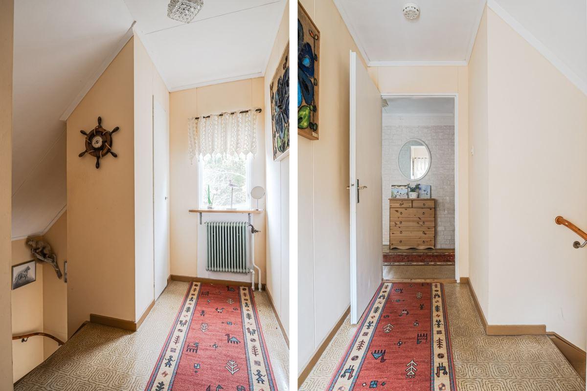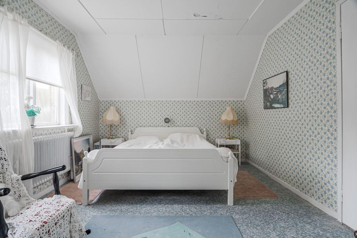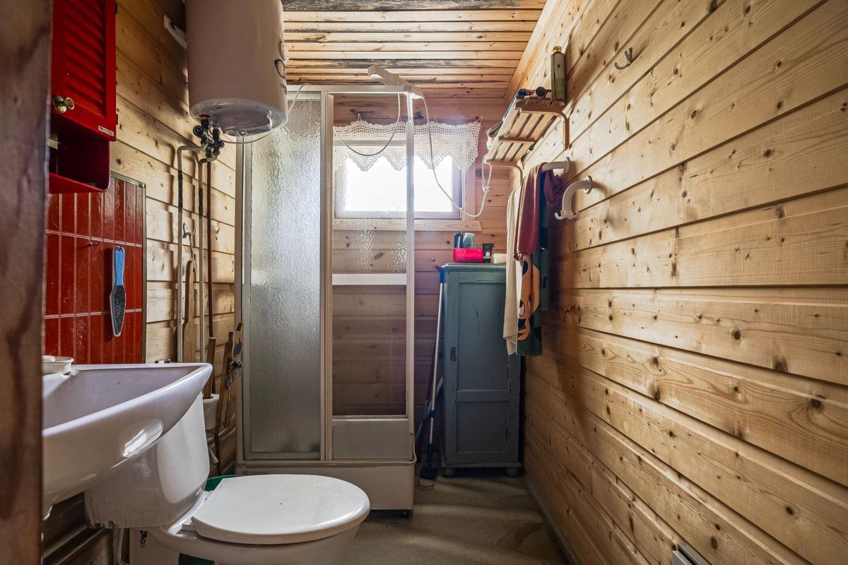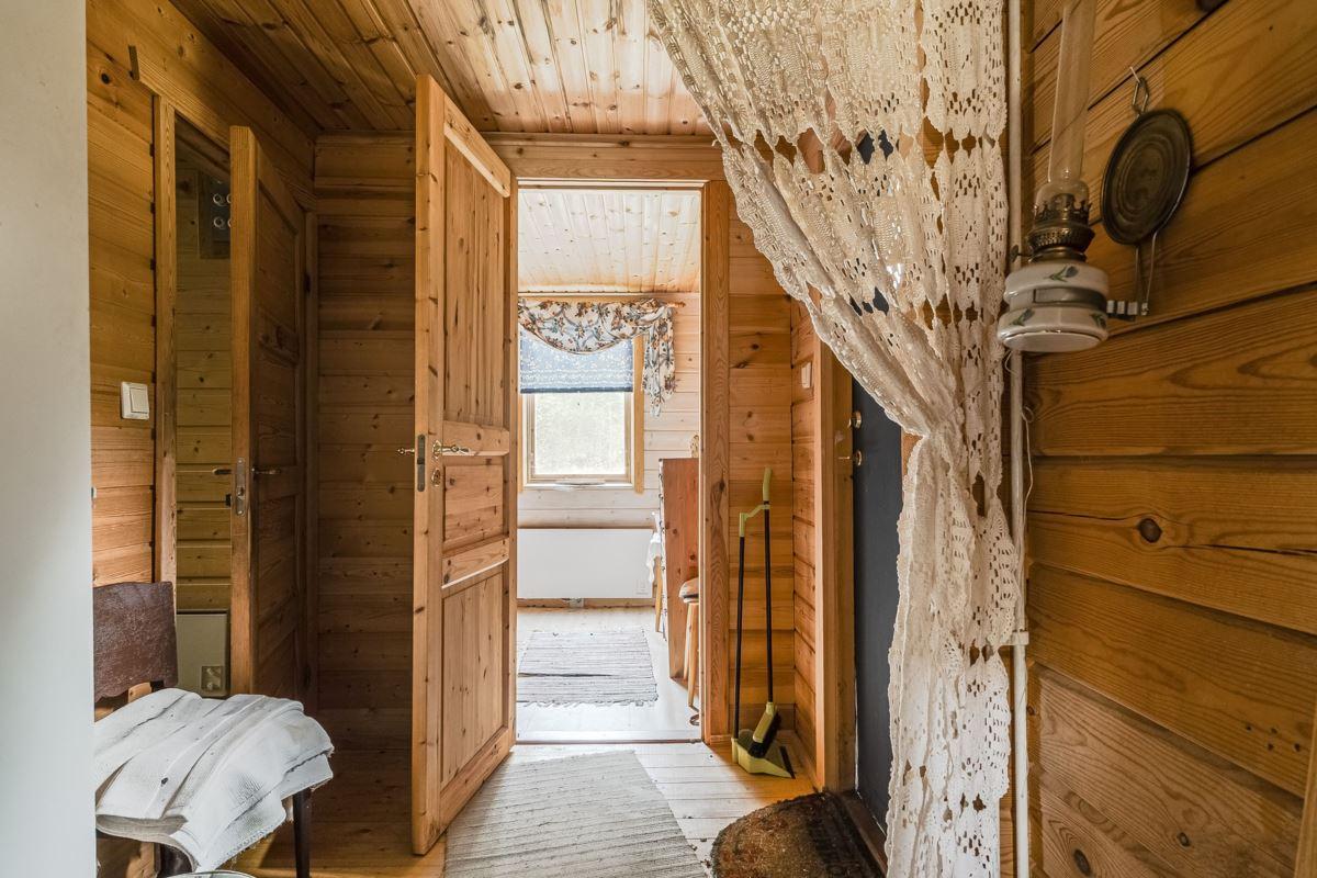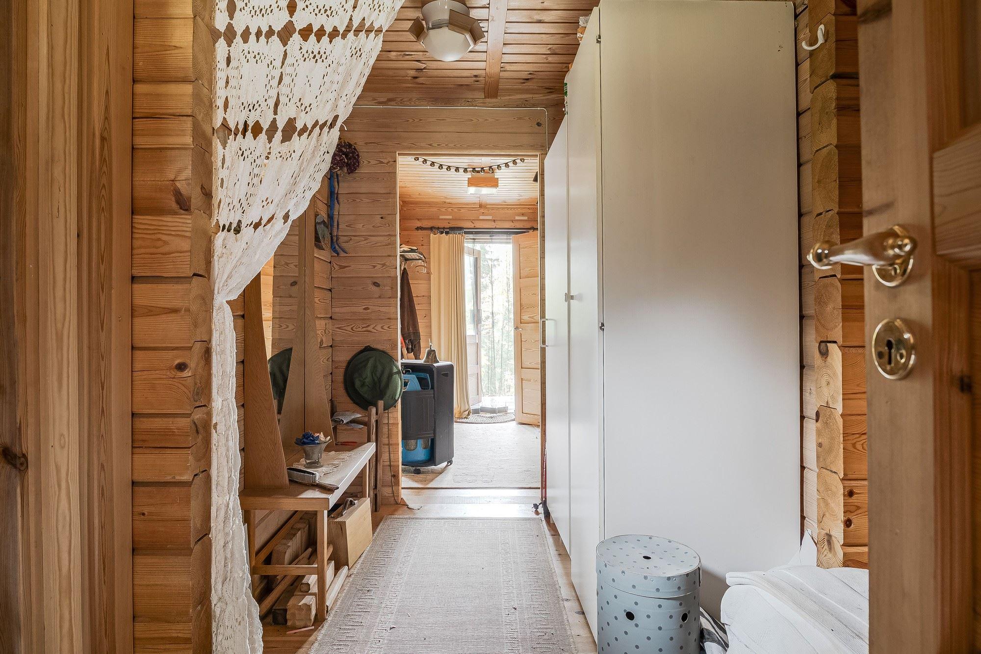 Direkt till vänster från hallen hittar du sovrum med våningssäng, trägolv och träpanel på vägg. Vidare genom hallen ligger ytterligare sovrum med plats för dubbelsäng, trägolv och träpanel på vägg. Genom nästa dörr från hallen kommer du in till duschrummet utrustat med toalett, dusch och tvättställ, plastmatta på golv, träpanel samt skiva på vägg. Längst bort i hallen finns ytterligare ytterdörr samt stugans sista sovrum med plats för dubbelsäng, plastmatta på golv och träpanel på vägg.