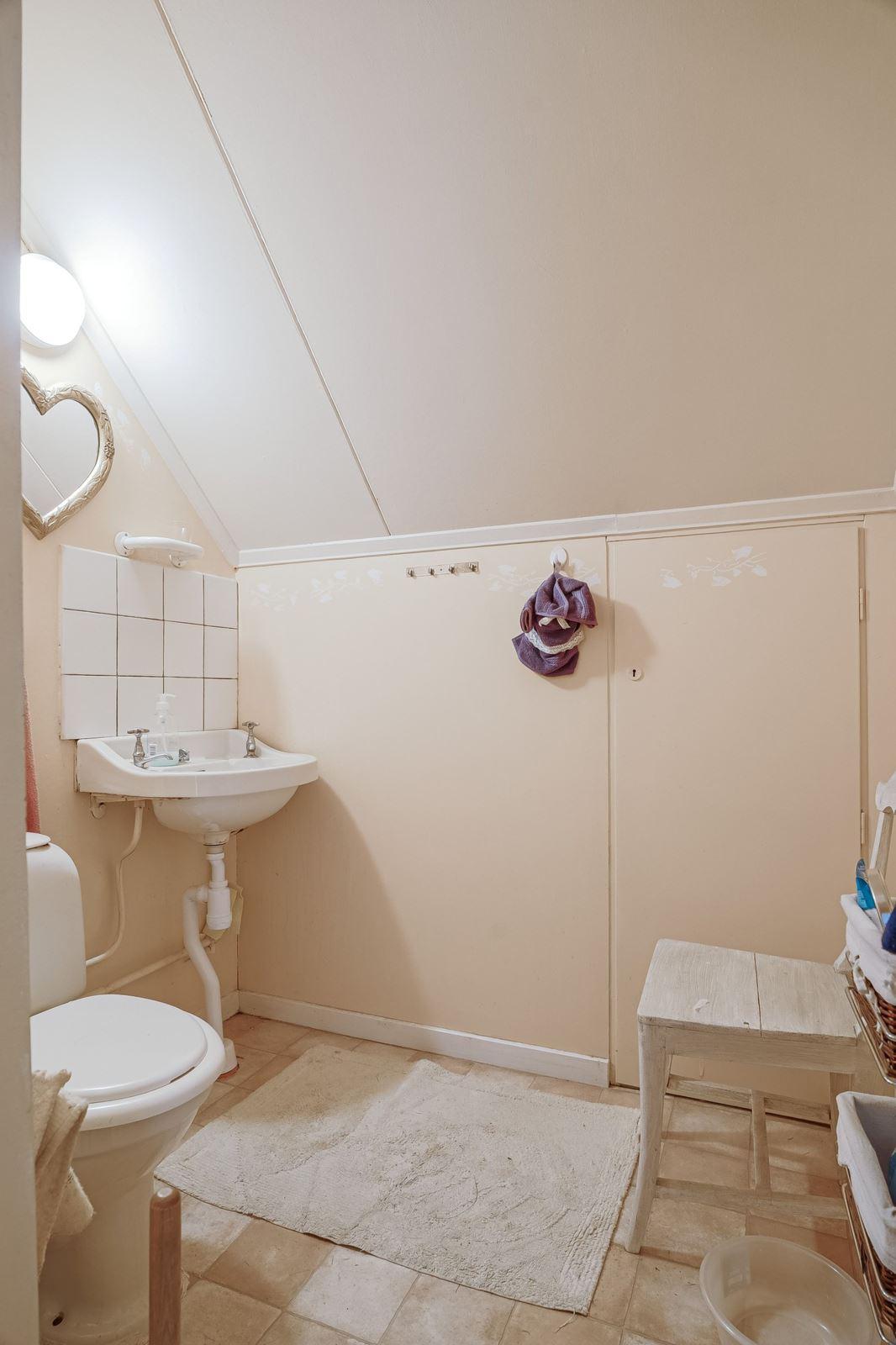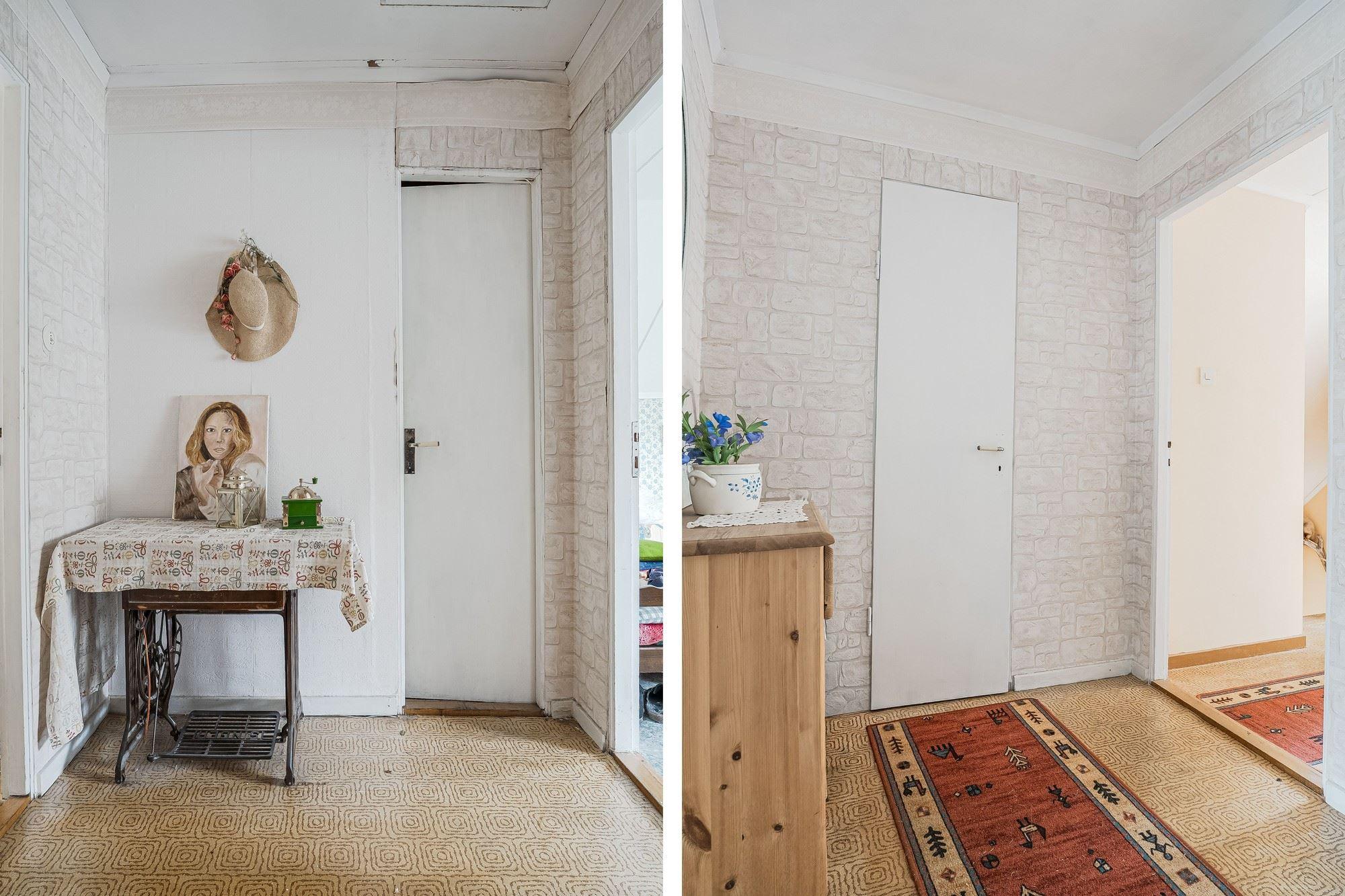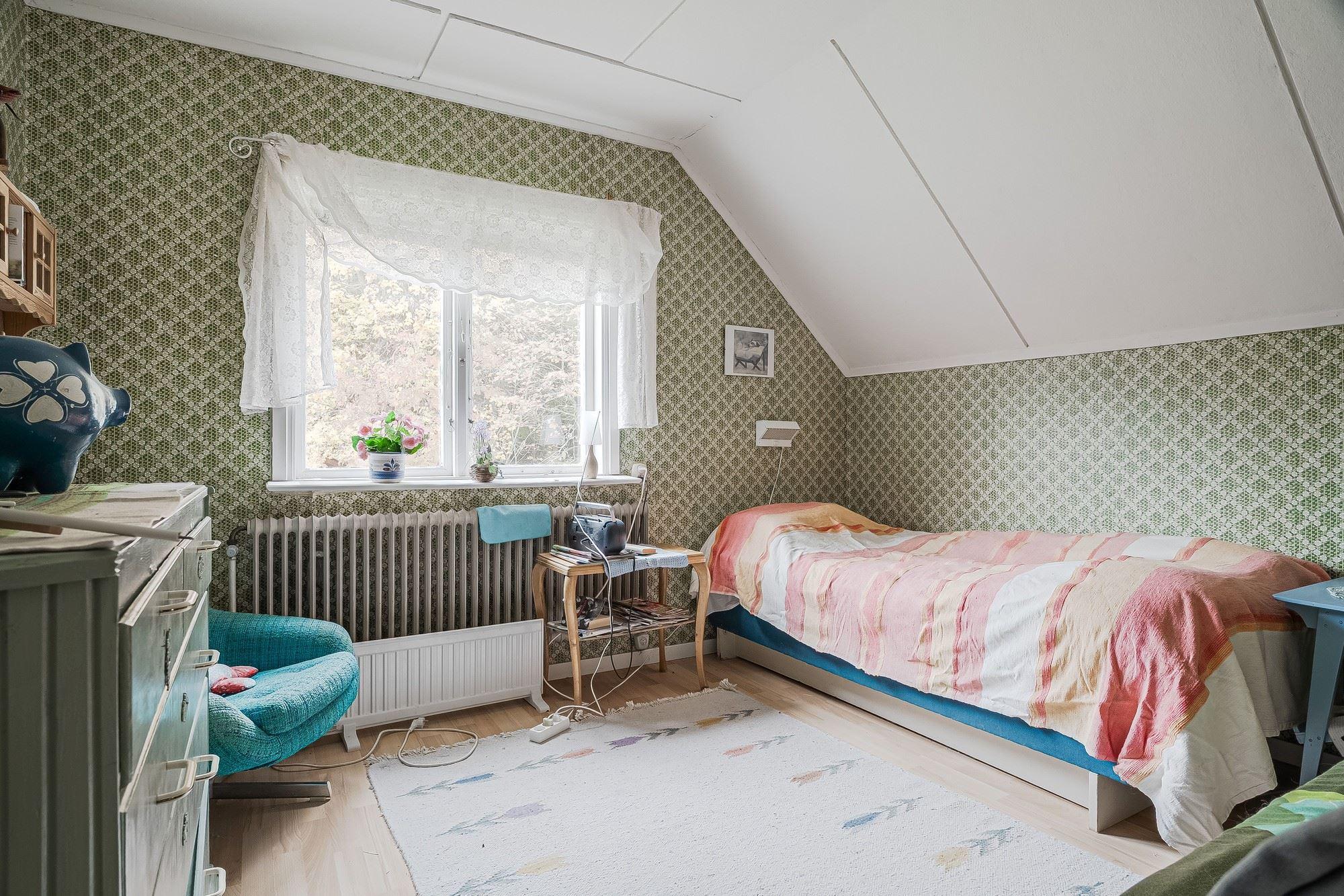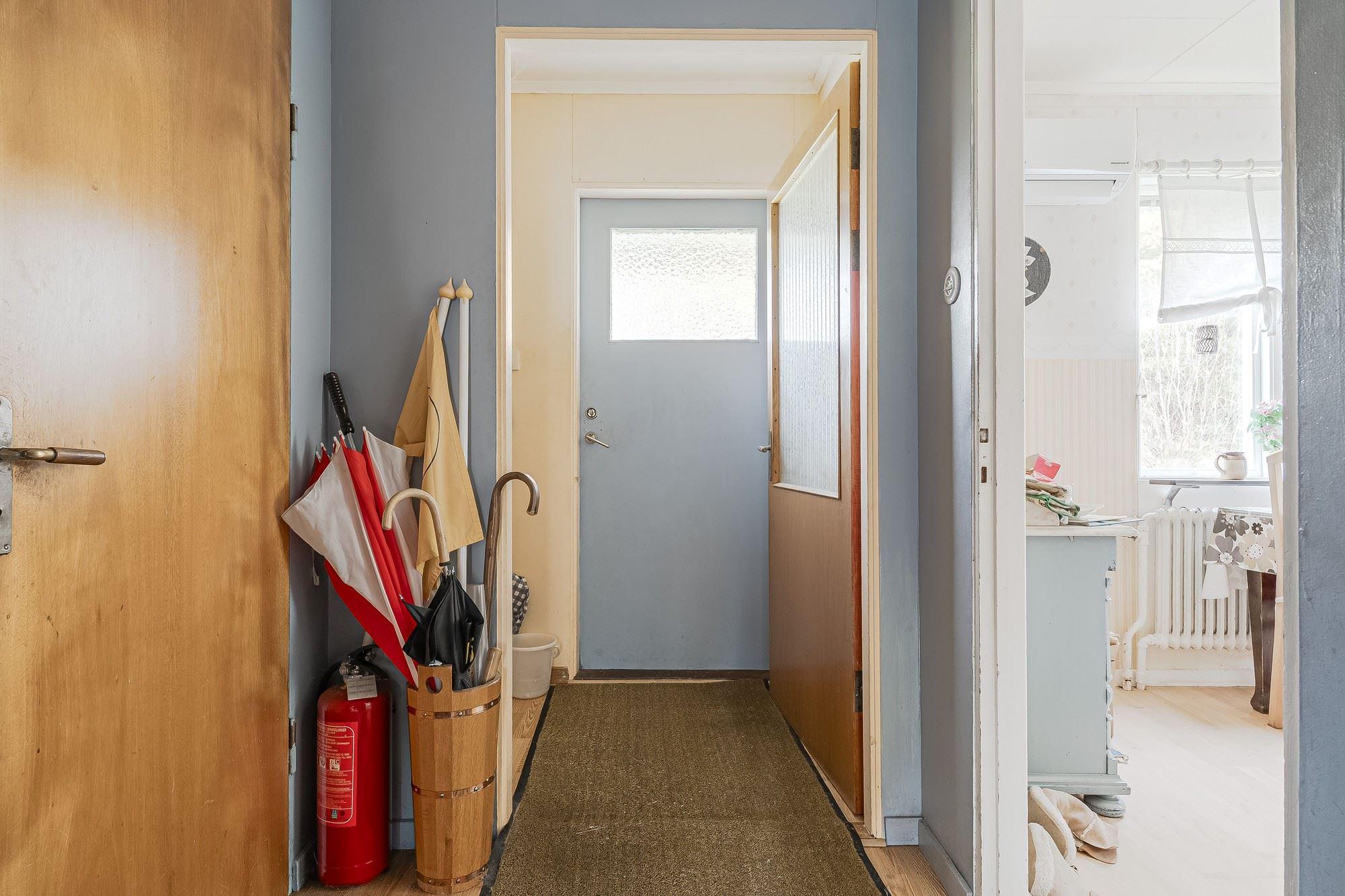 Direkt till vänster från hallen hittar du sovrum med våningssäng, trägolv och träpanel på vägg. Vidare genom hallen ligger ytterligare sovrum med plats för dubbelsäng, trägolv och träpanel på vägg. Genom nästa dörr från hallen kommer du in till duschrummet utrustat med toalett, dusch och tvättställ, plastmatta på golv, träpanel samt skiva på vägg. Längst bort i hallen finns ytterligare ytterdörr samt stugans sista sovrum med plats för dubbelsäng, plastmatta på golv och träpanel på vägg.