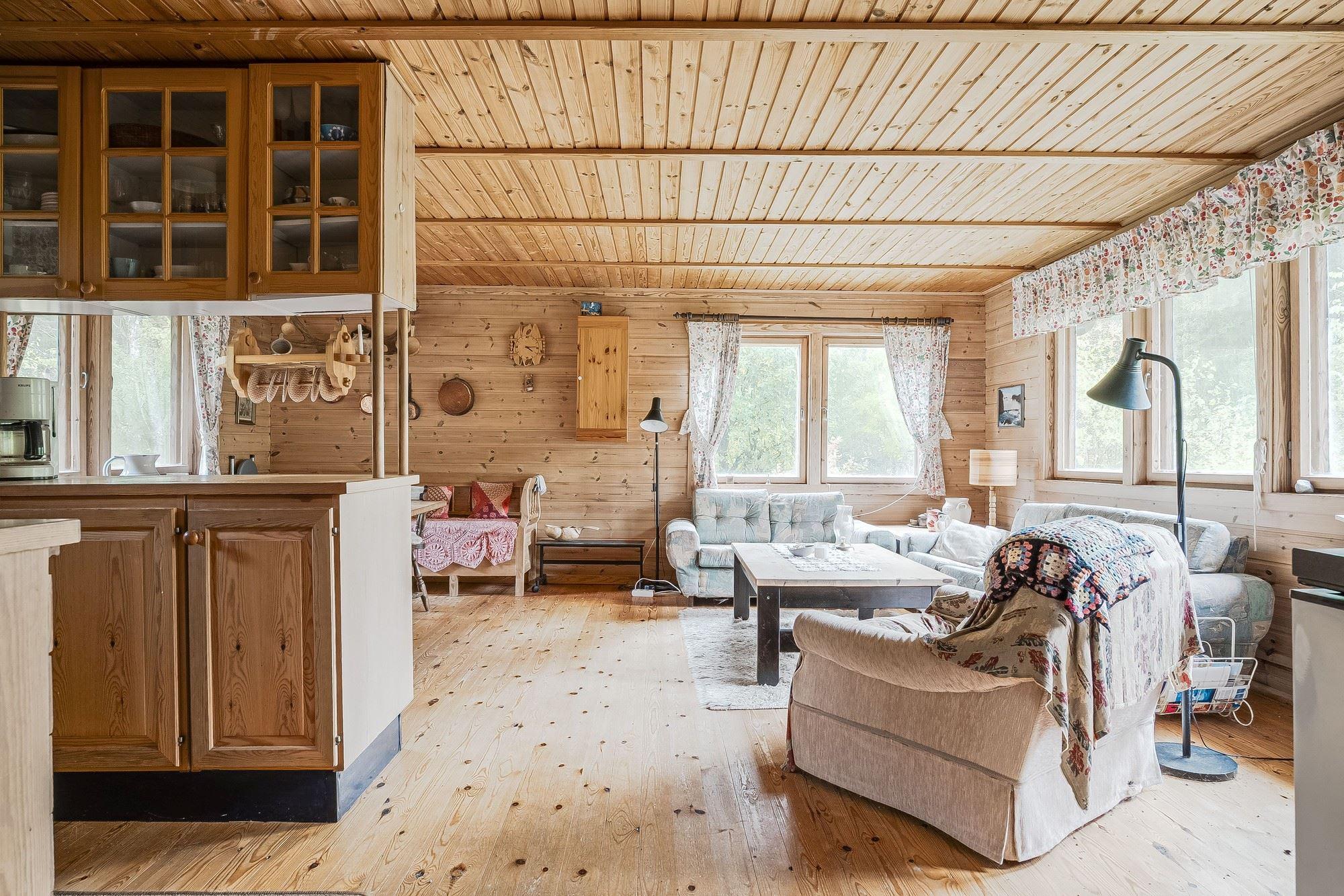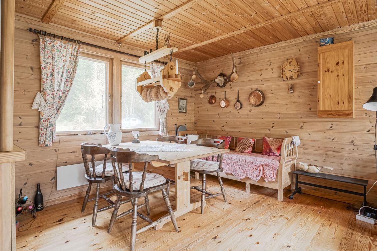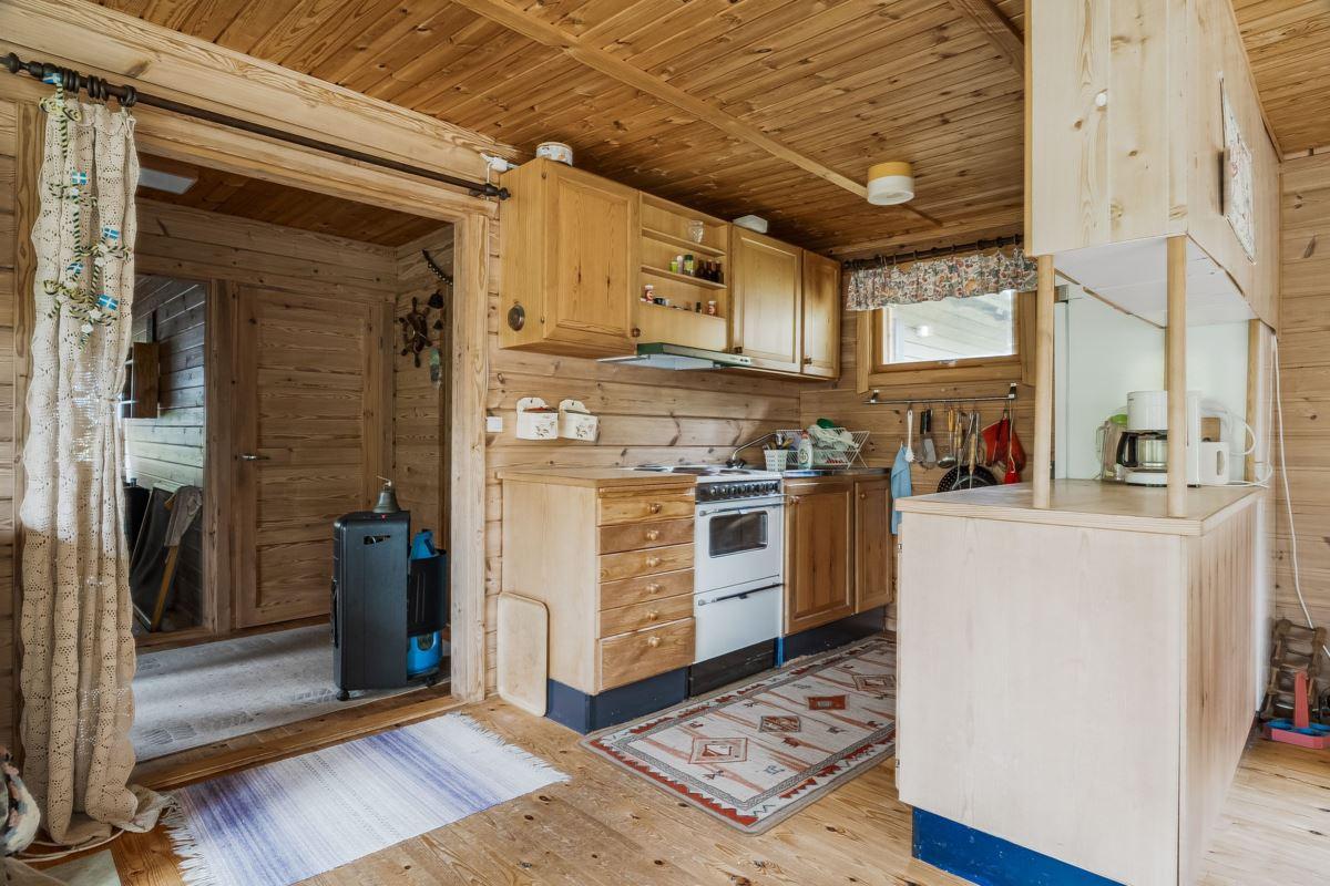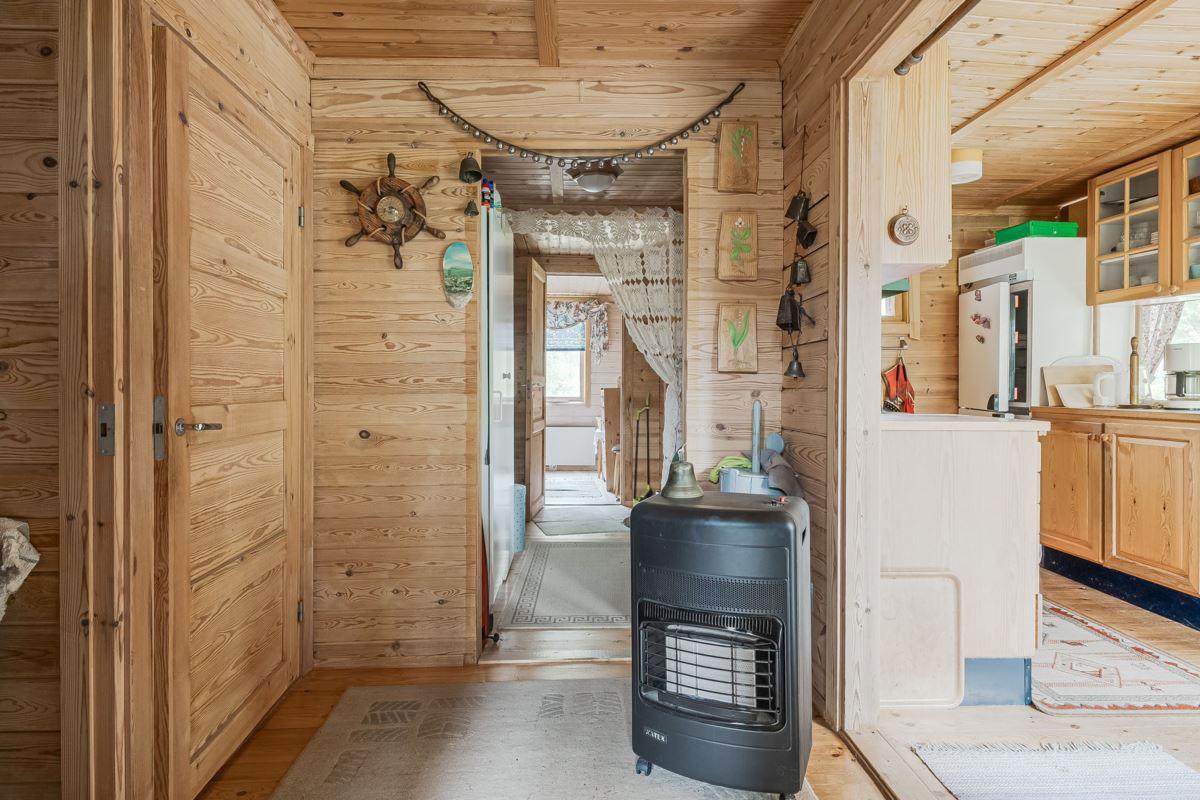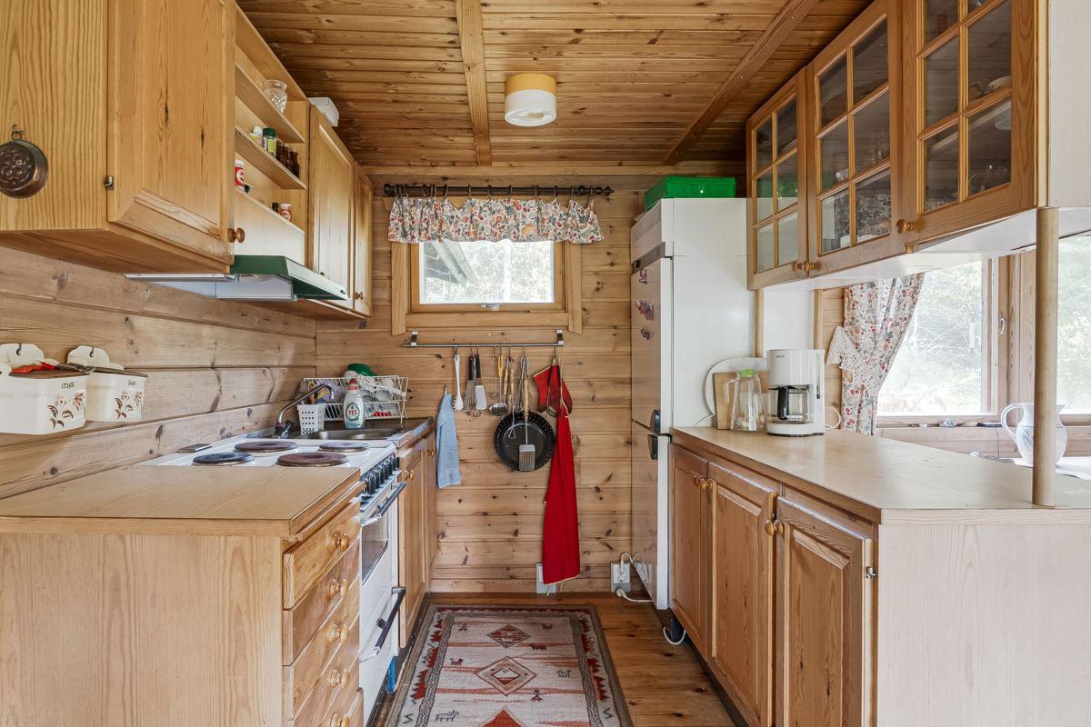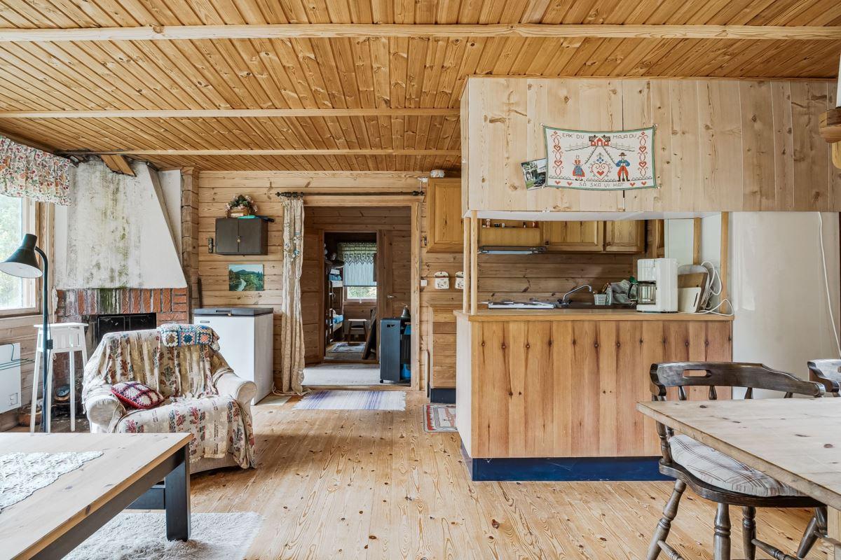 Ingång via altan med utsikt mot den porlande bäcken in till hall med trägolv och träpanel på vägg med öppen planlösning mot det kombinerade köket och vardagsrummet med plats för matbord och soffgrupp framför eldstaden (okänt skick). Köket är utrustat med köksförvaring, spis, kyl och frys.