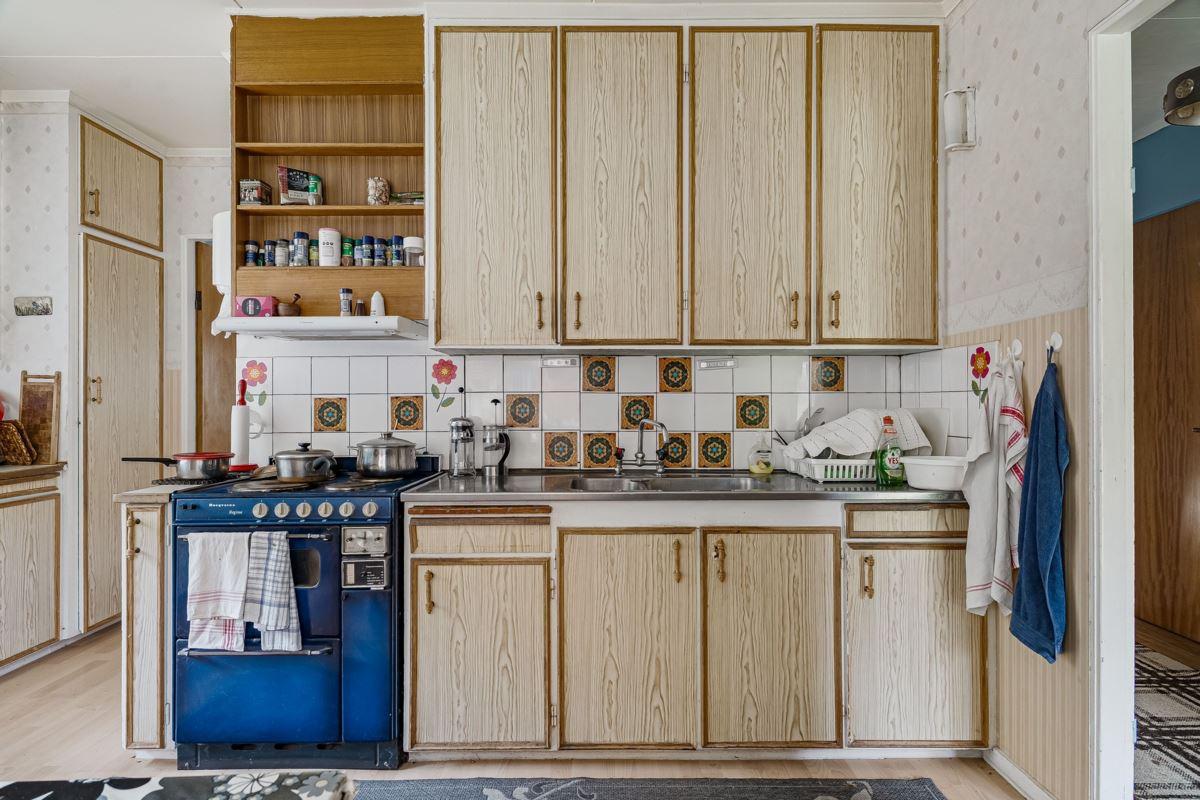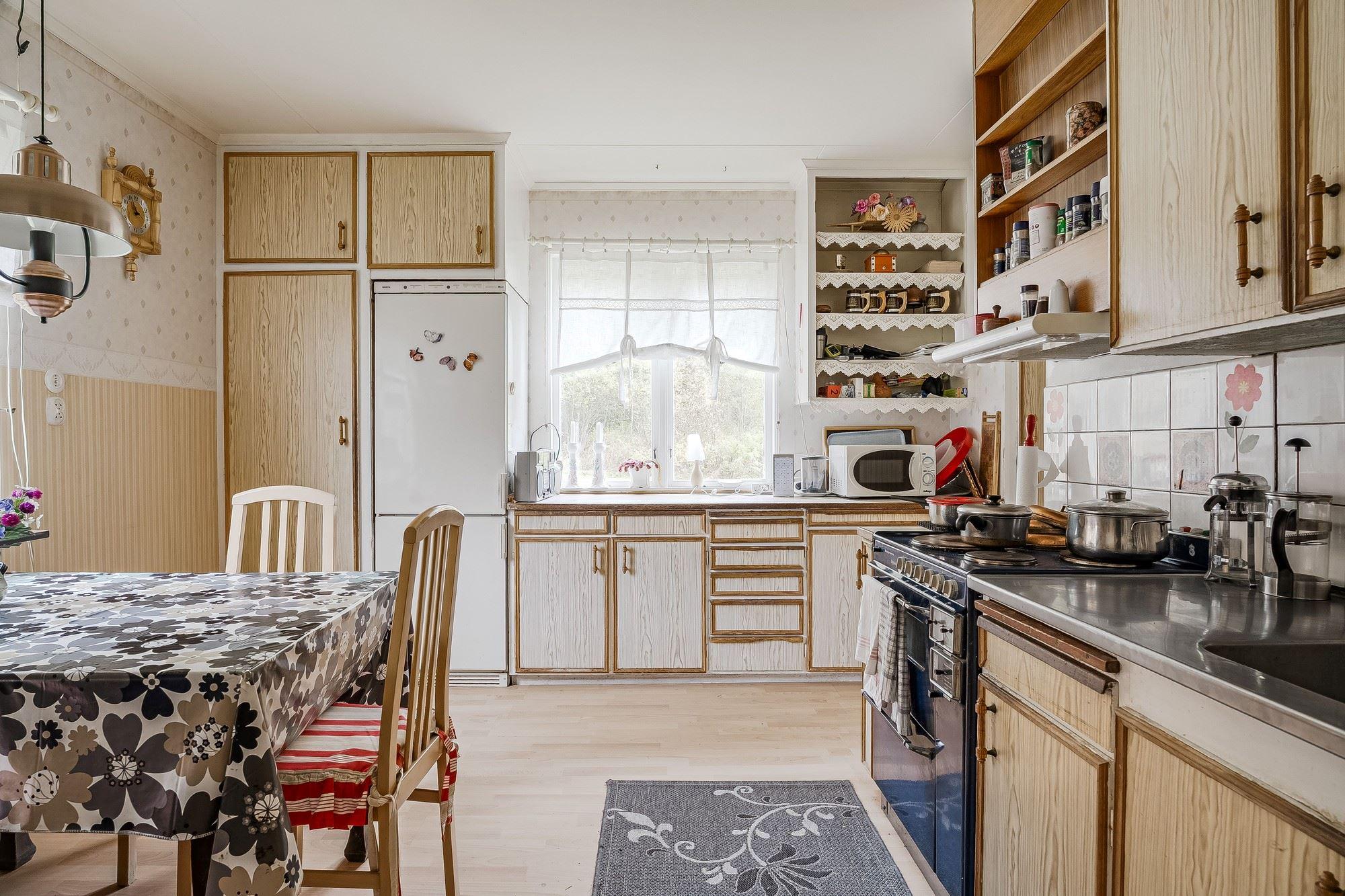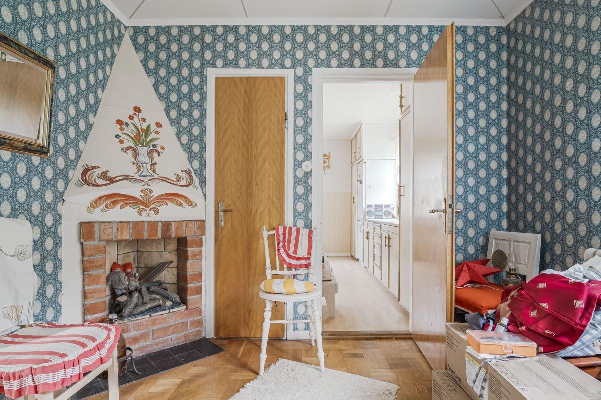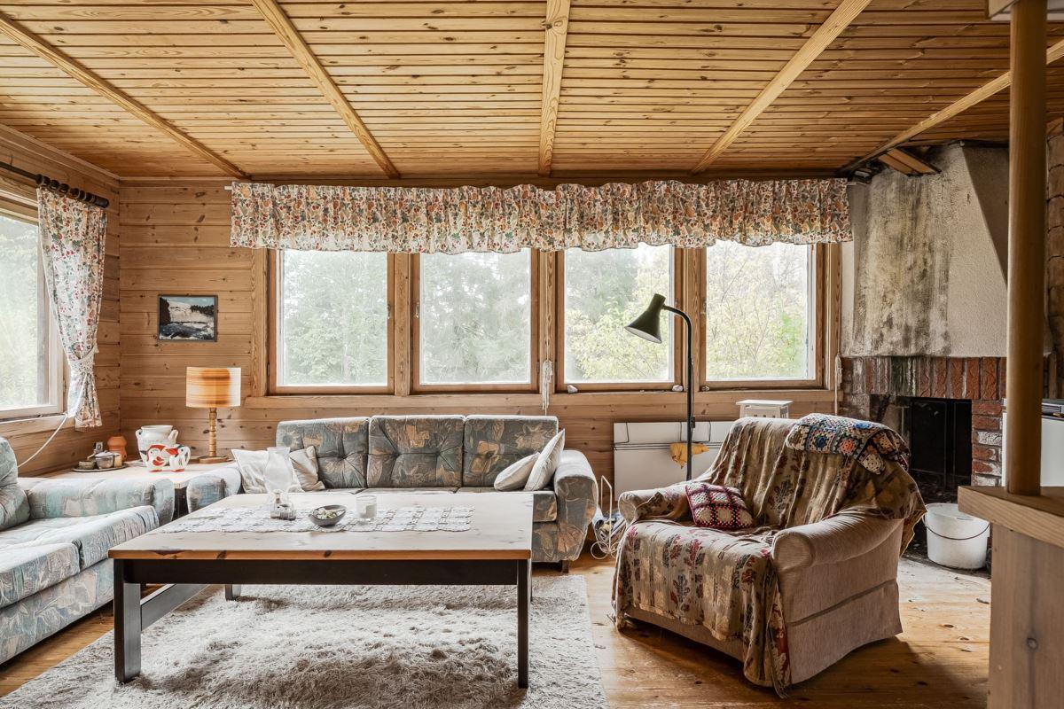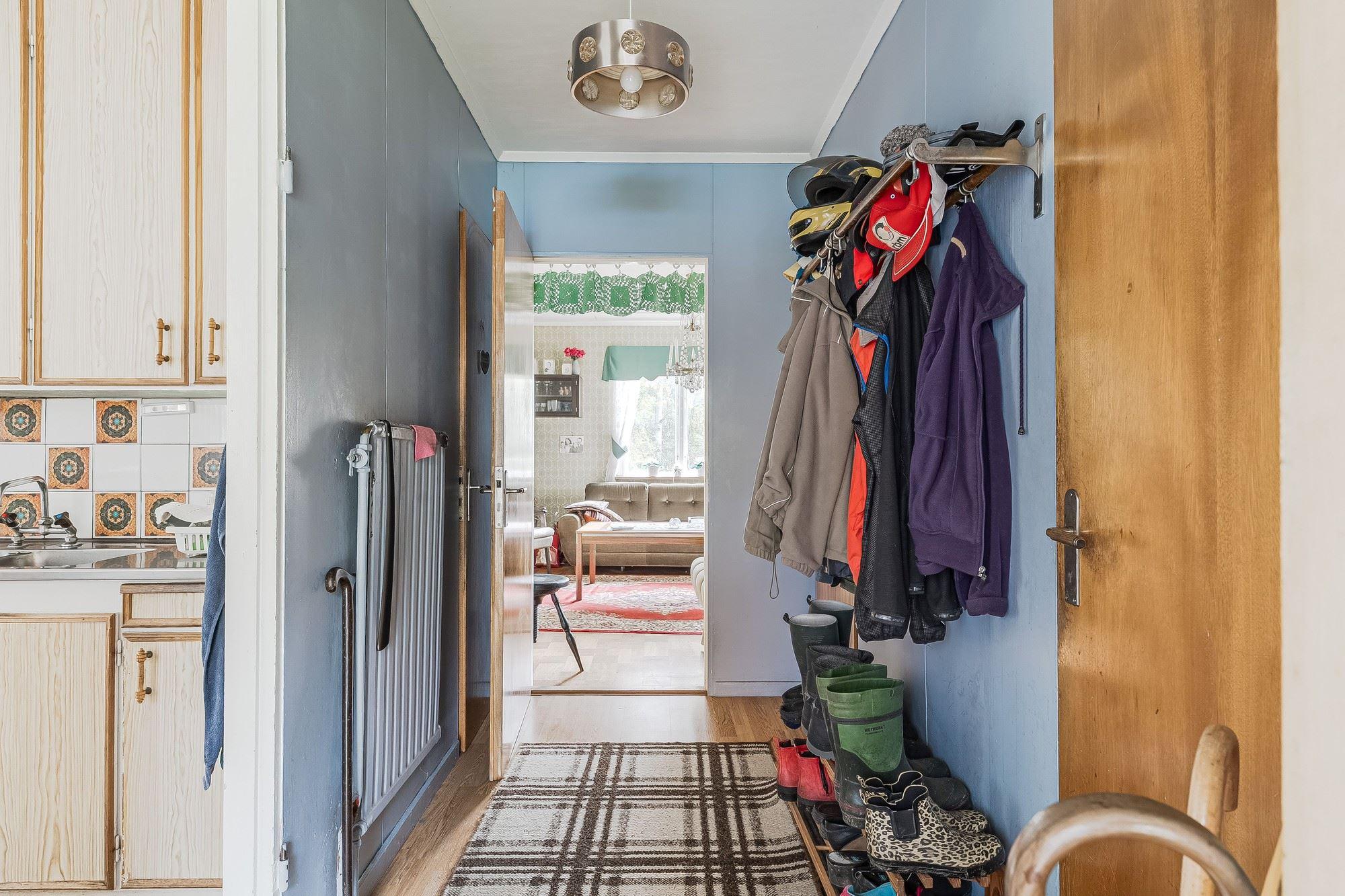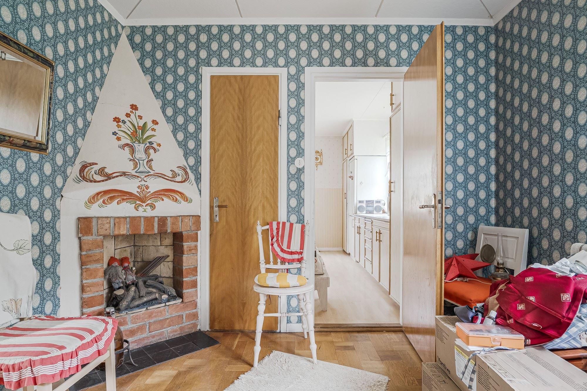 Ingång via altan med utsikt mot den porlande bäcken in till hall med trägolv och träpanel på vägg med öppen planlösning mot det kombinerade köket och vardagsrummet med plats för matbord och soffgrupp framför eldstaden (okänt skick). Köket är utrustat med köksförvaring, spis, kyl och frys.