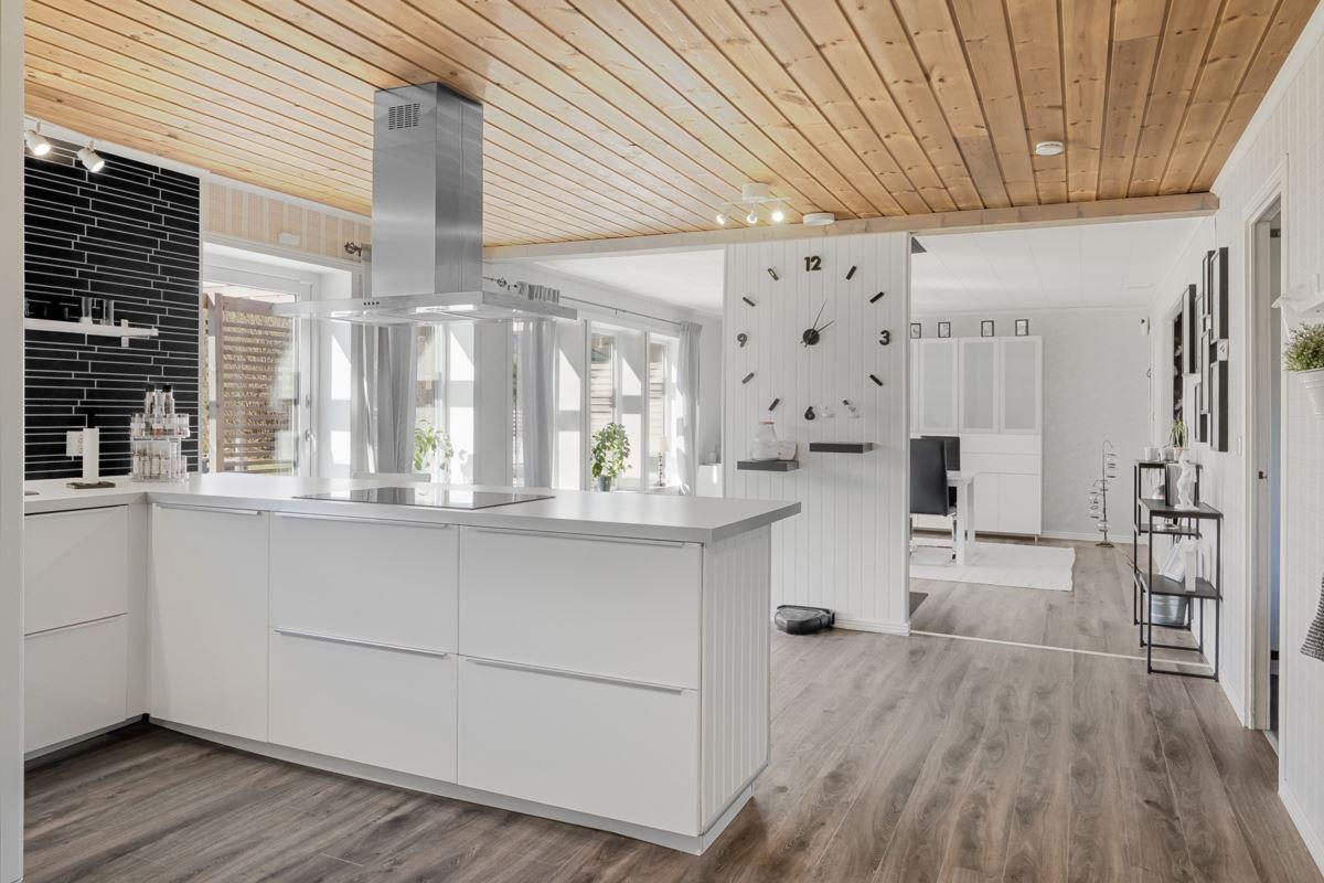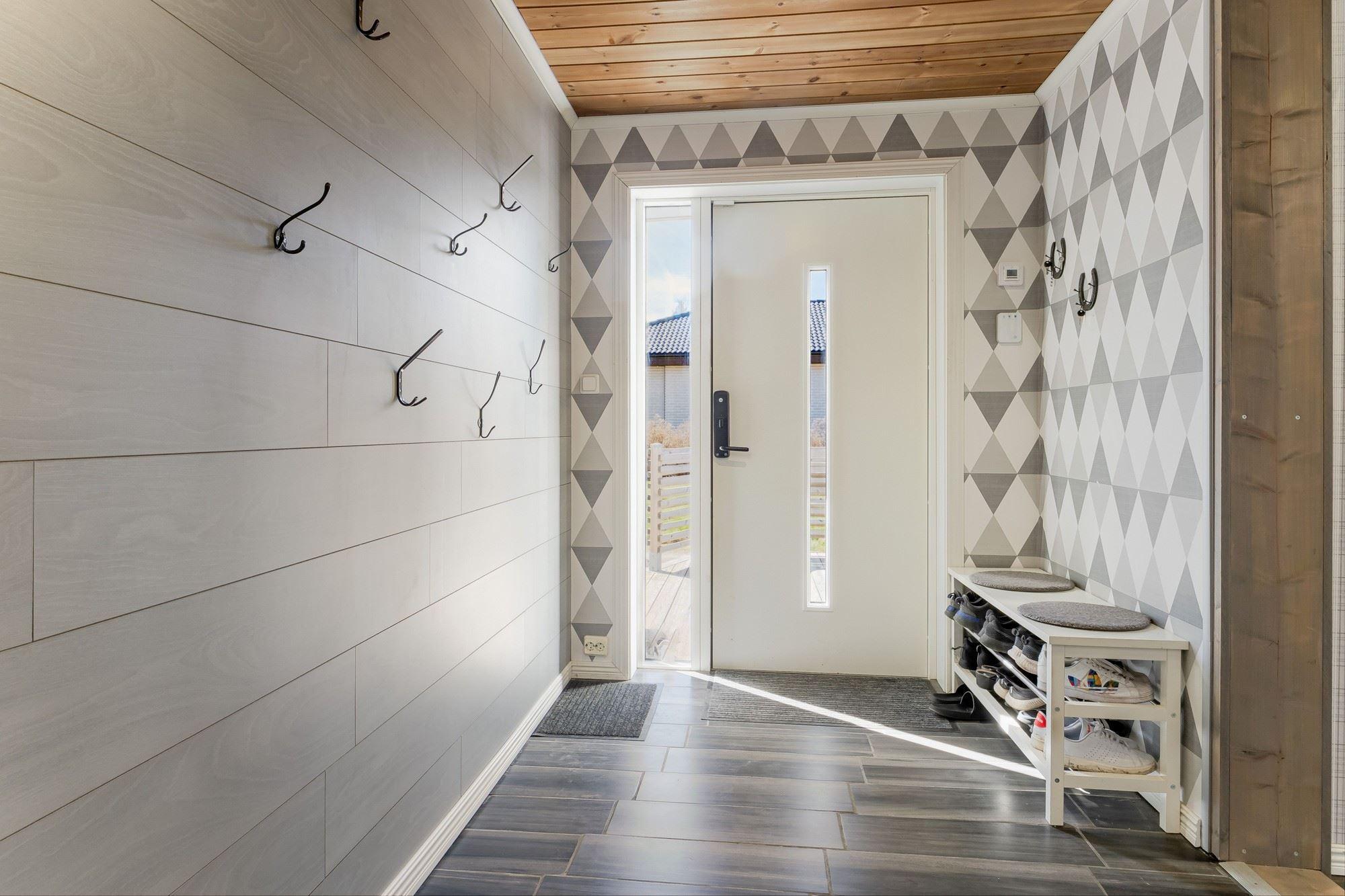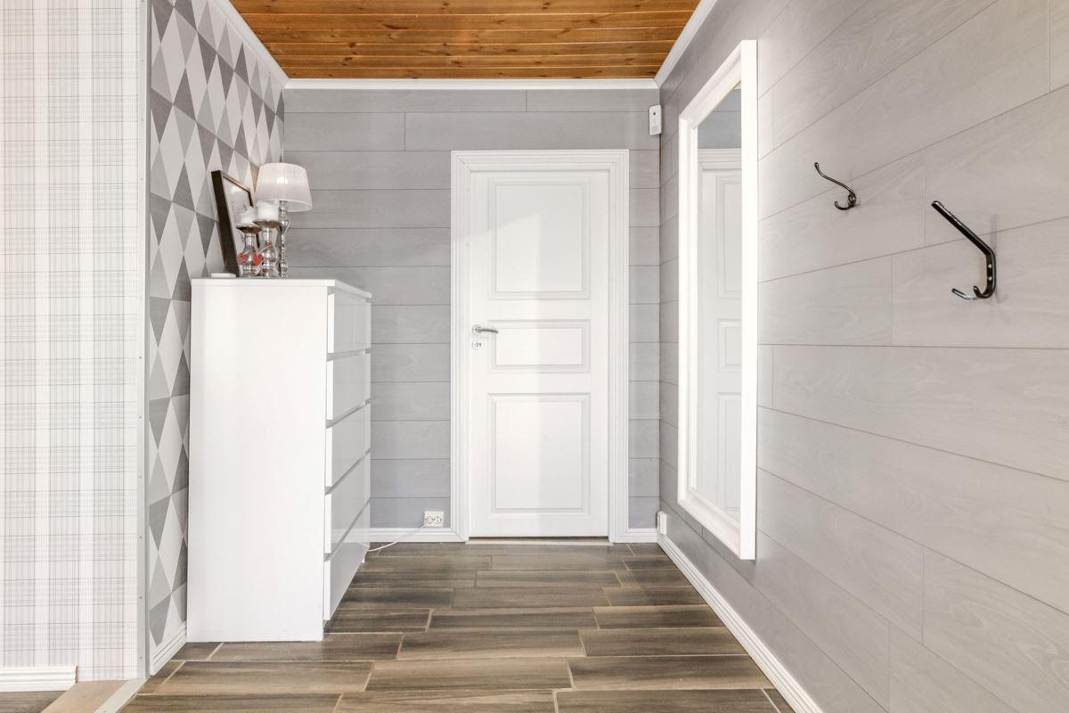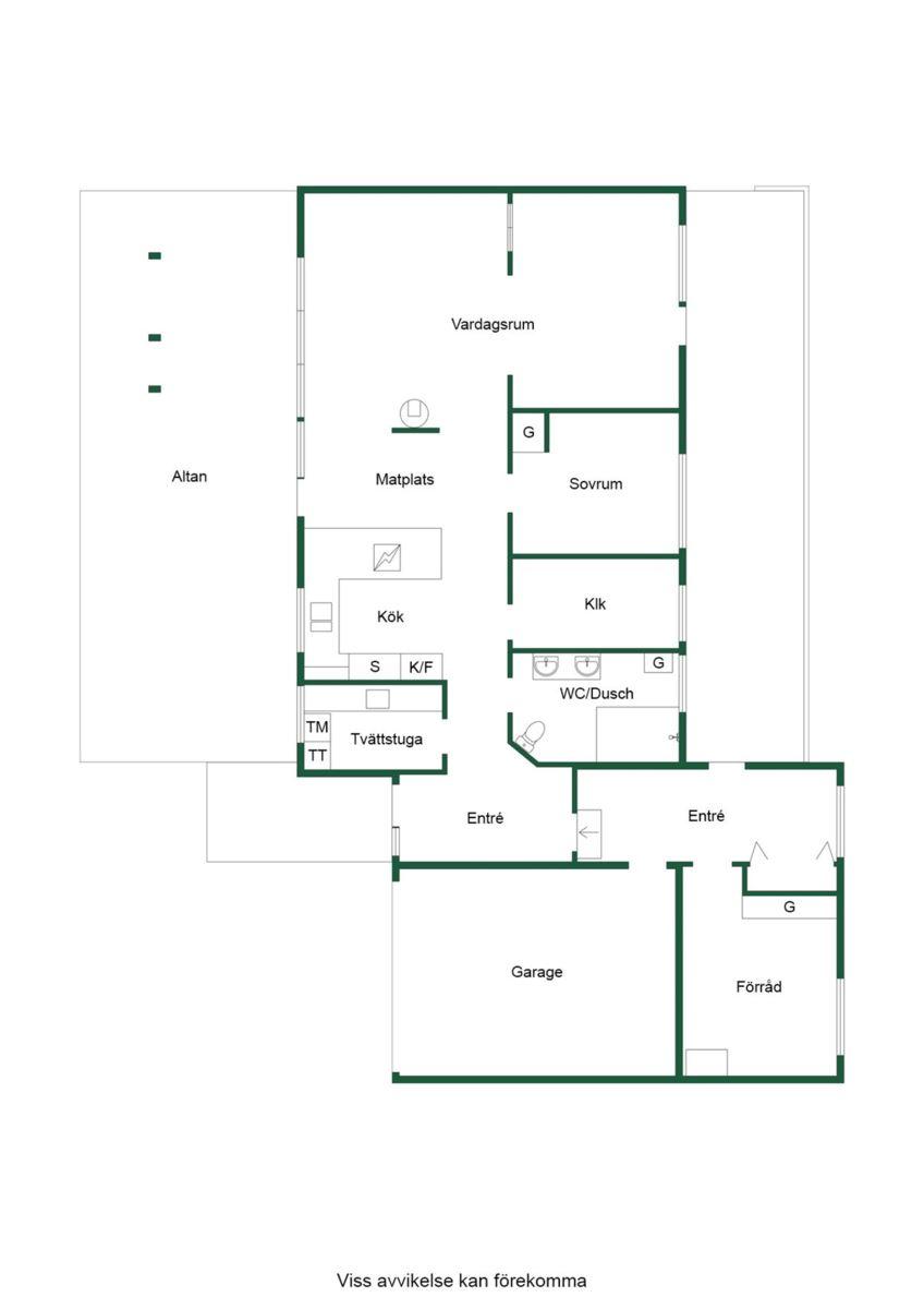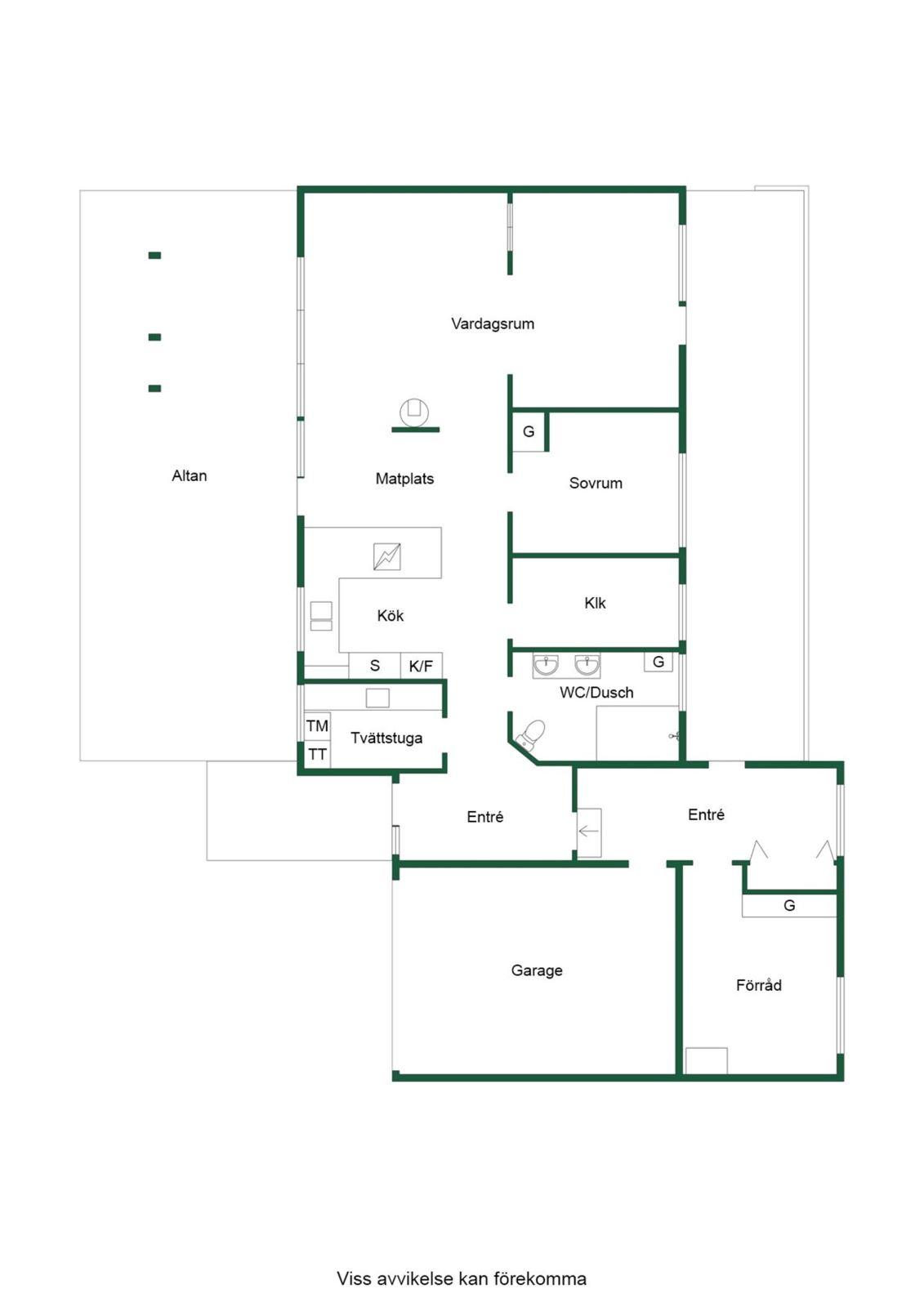 Entré med klinkergolv leder vidare till groventré med access till sovrum, garage och trädgård med altan på baksidan. Fin tvättstuga renoverad 2017. Helkaklat duschrum som har renoverats 2017 med golvvärme. Stort, ljust kök i öppen planlösning med matrum – renoverat 2015 och fullt utrustat. Här finns även pelletskamin och utgång till rymlig altan med pergola. Vardagsrum samt två sovrum, varav ett med garderobssystem/walk-in-closet. Ett trivsamt och välskött boende med bra standard – redo att flytta in i.