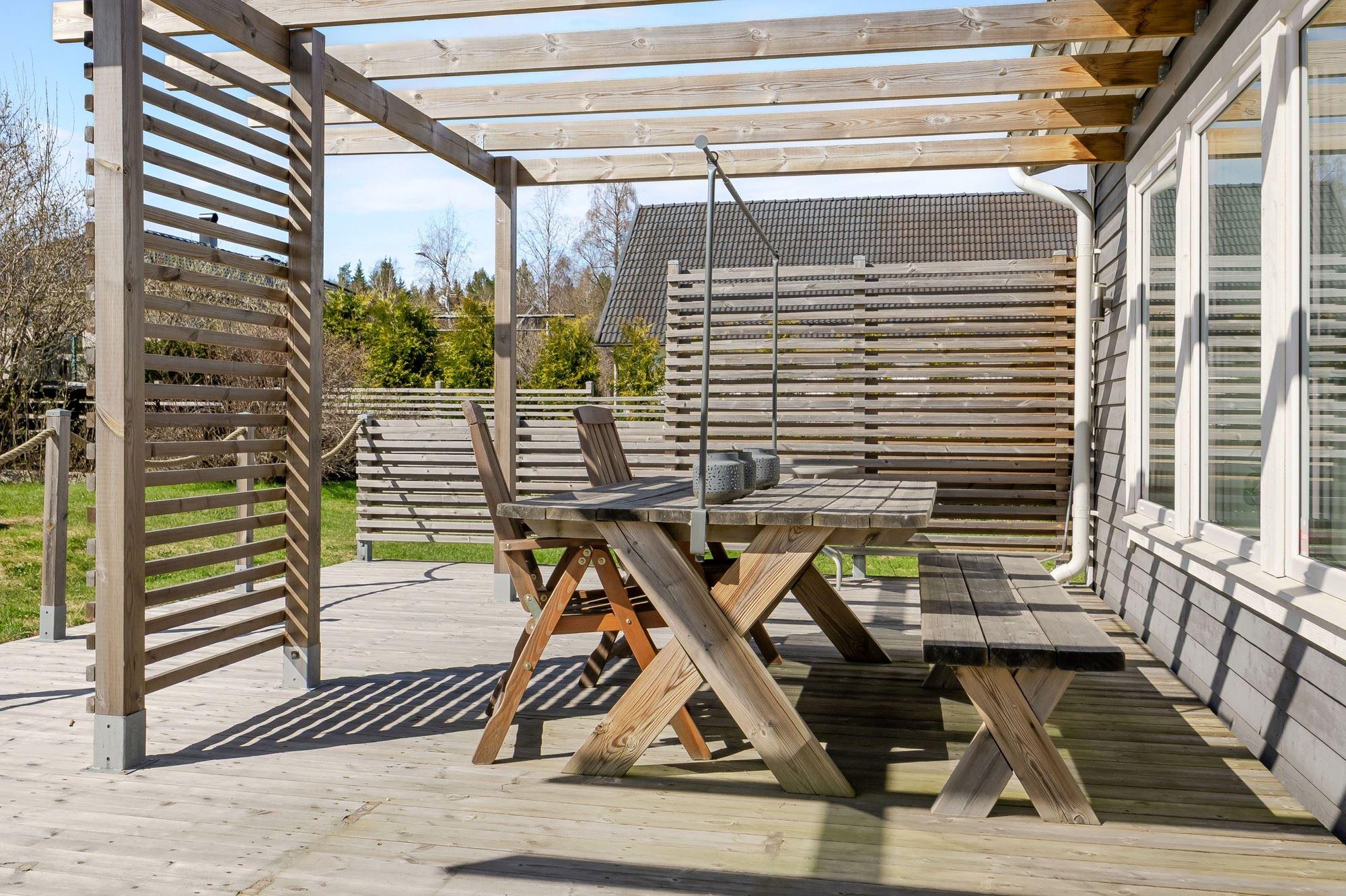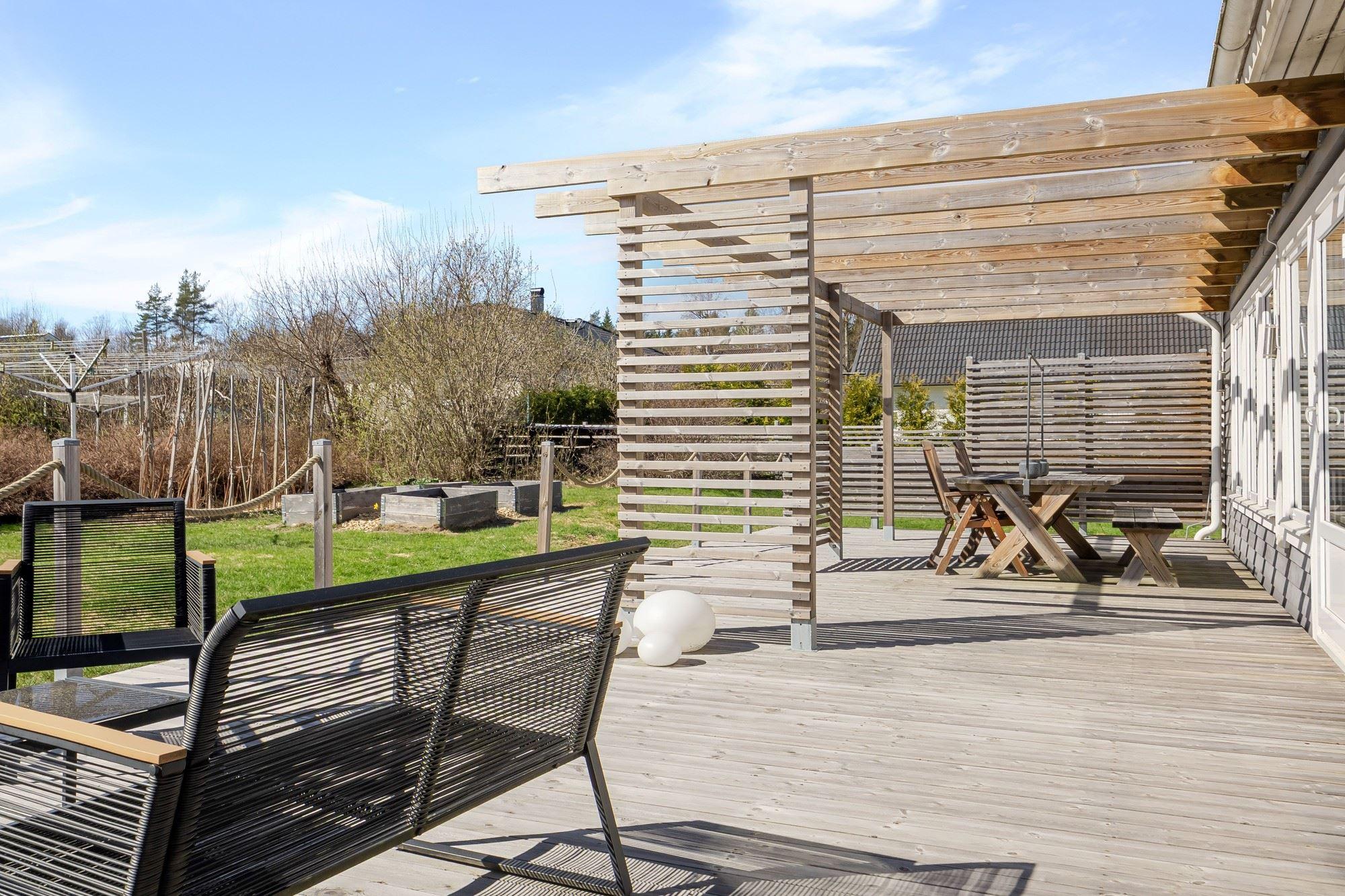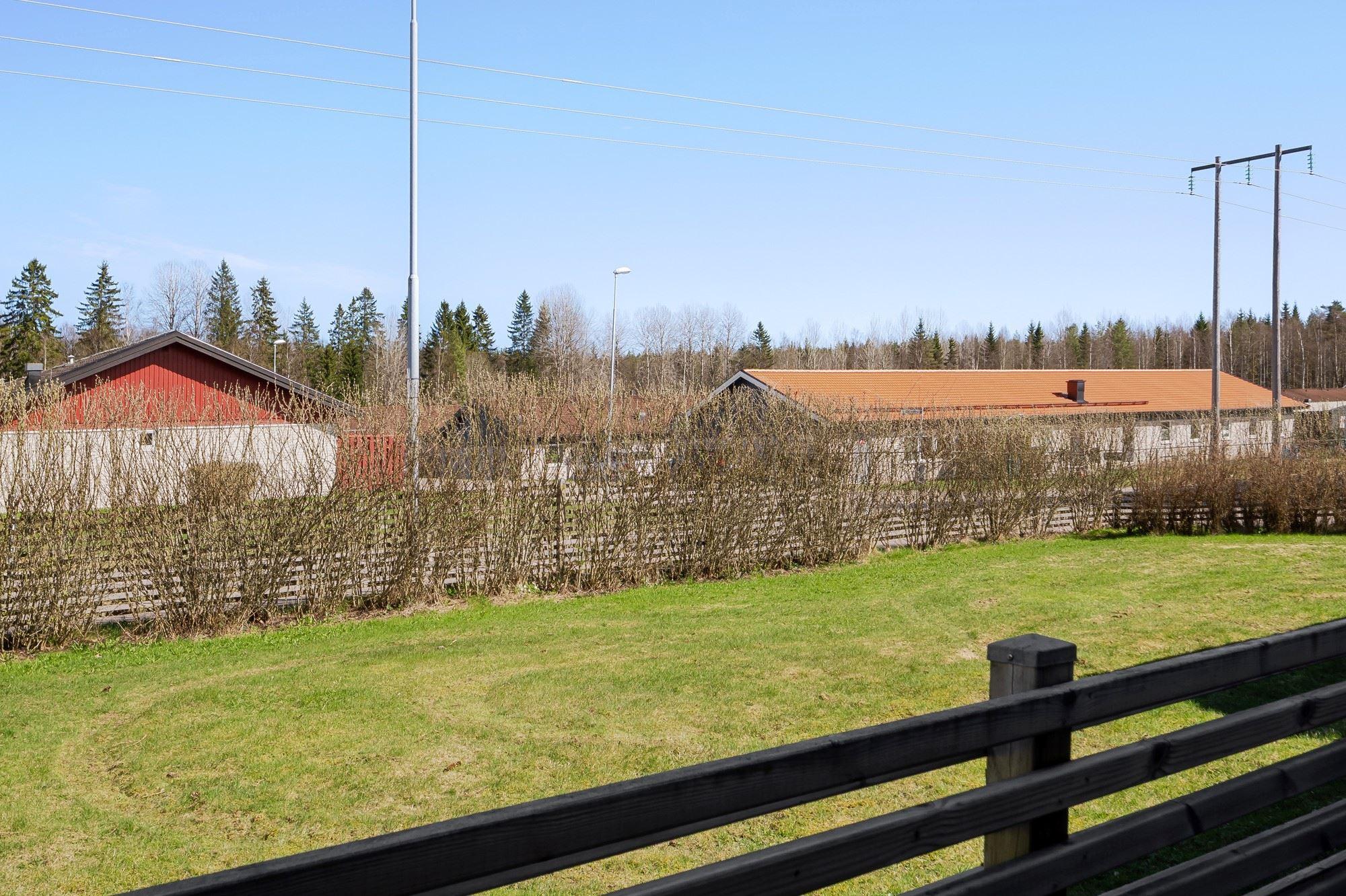 Plan och lättskött tomt med odlingslådor, hallonhäck och vinbärsbuskar. Asfalterad uppfart med parkeringsplatser framför garaget. Robotgrälsklippare finns och ingår i överlåtelsen!