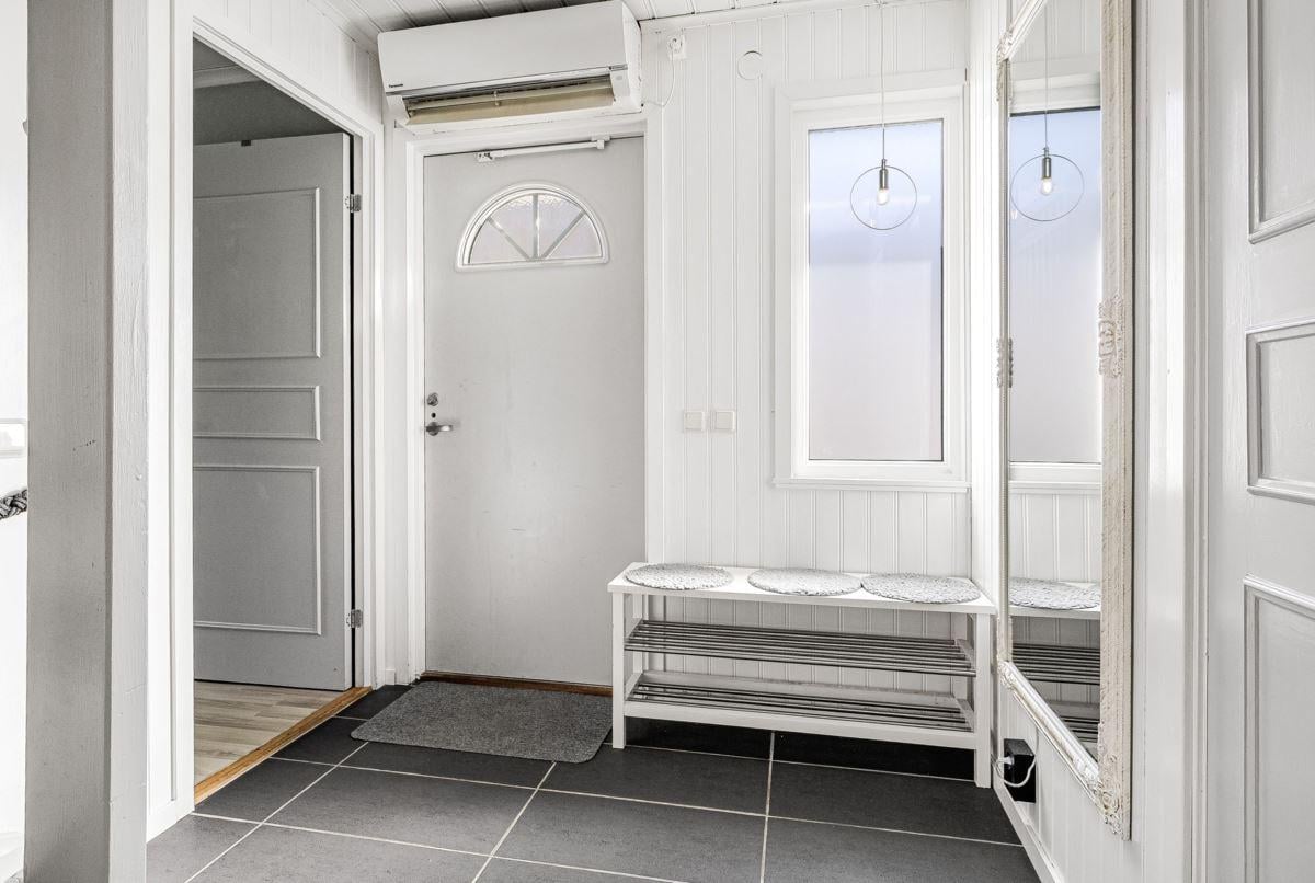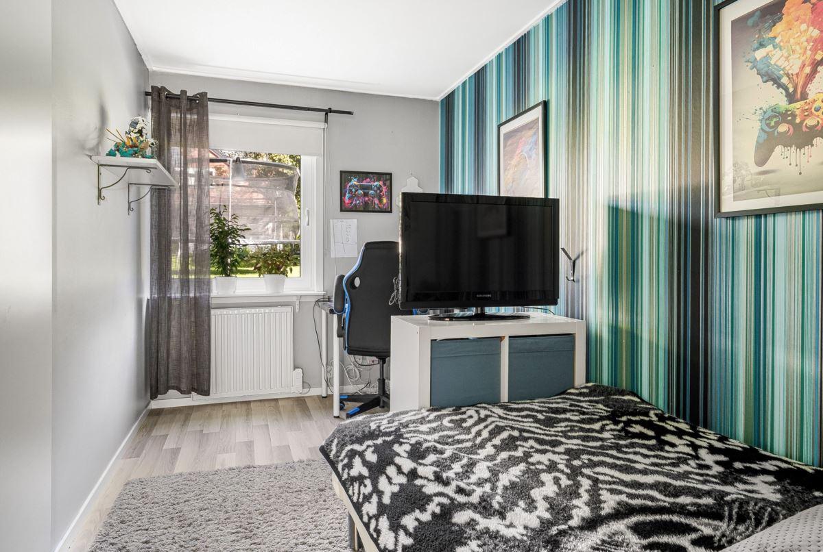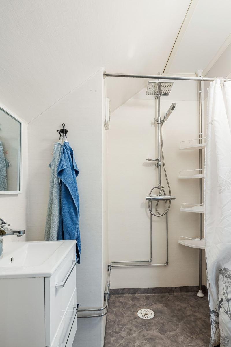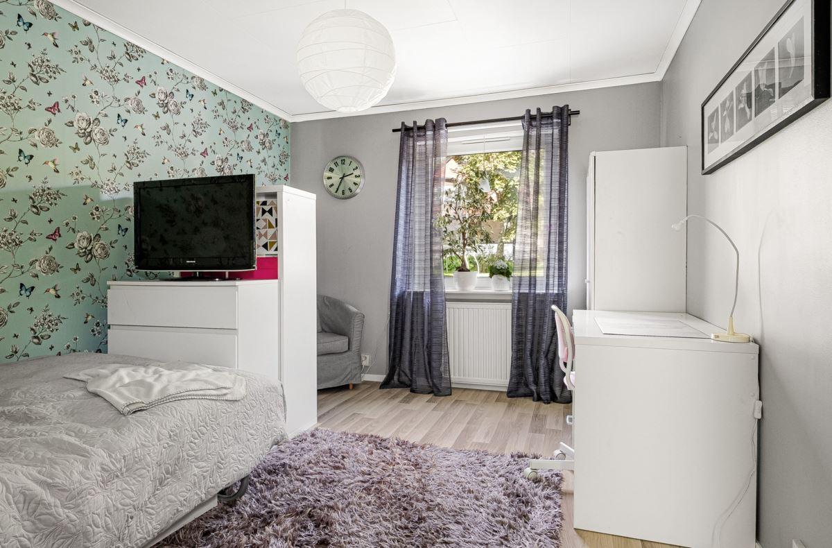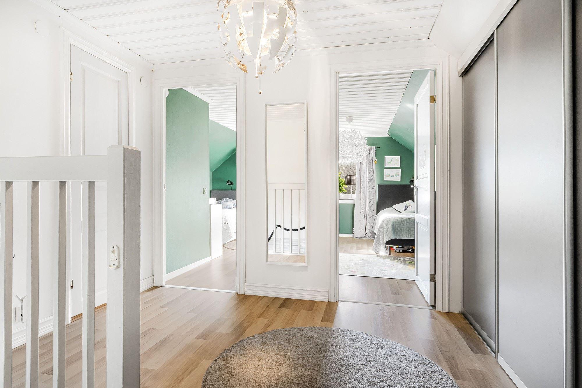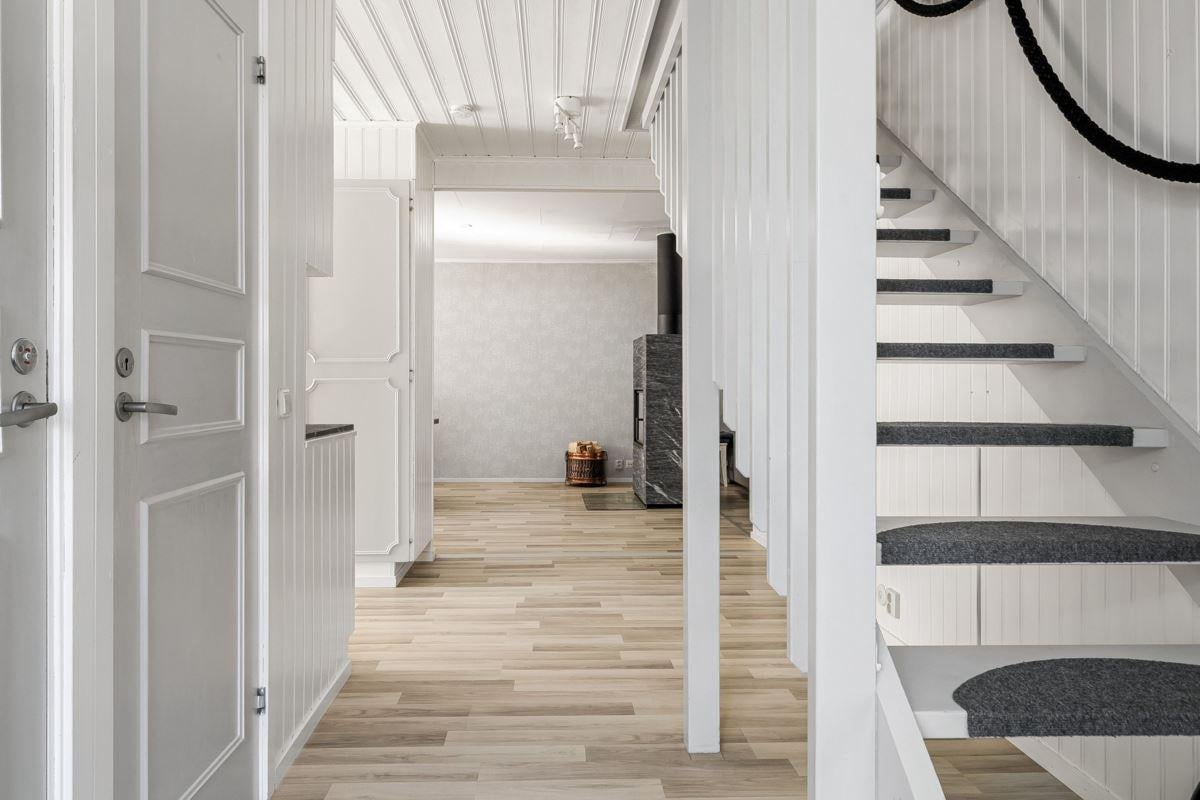 Entréplanet rymmer kök, två sovrum, duschrum och tvättstuga. Vidare finns matrum och vardagsrum i öppen planlösning. På det övre planet finns tre sovrum och ett duschrum. Fiber finns installerat i bostaden.