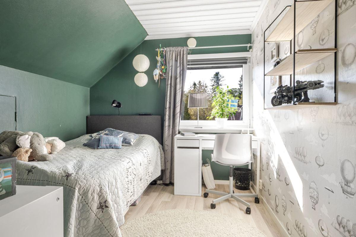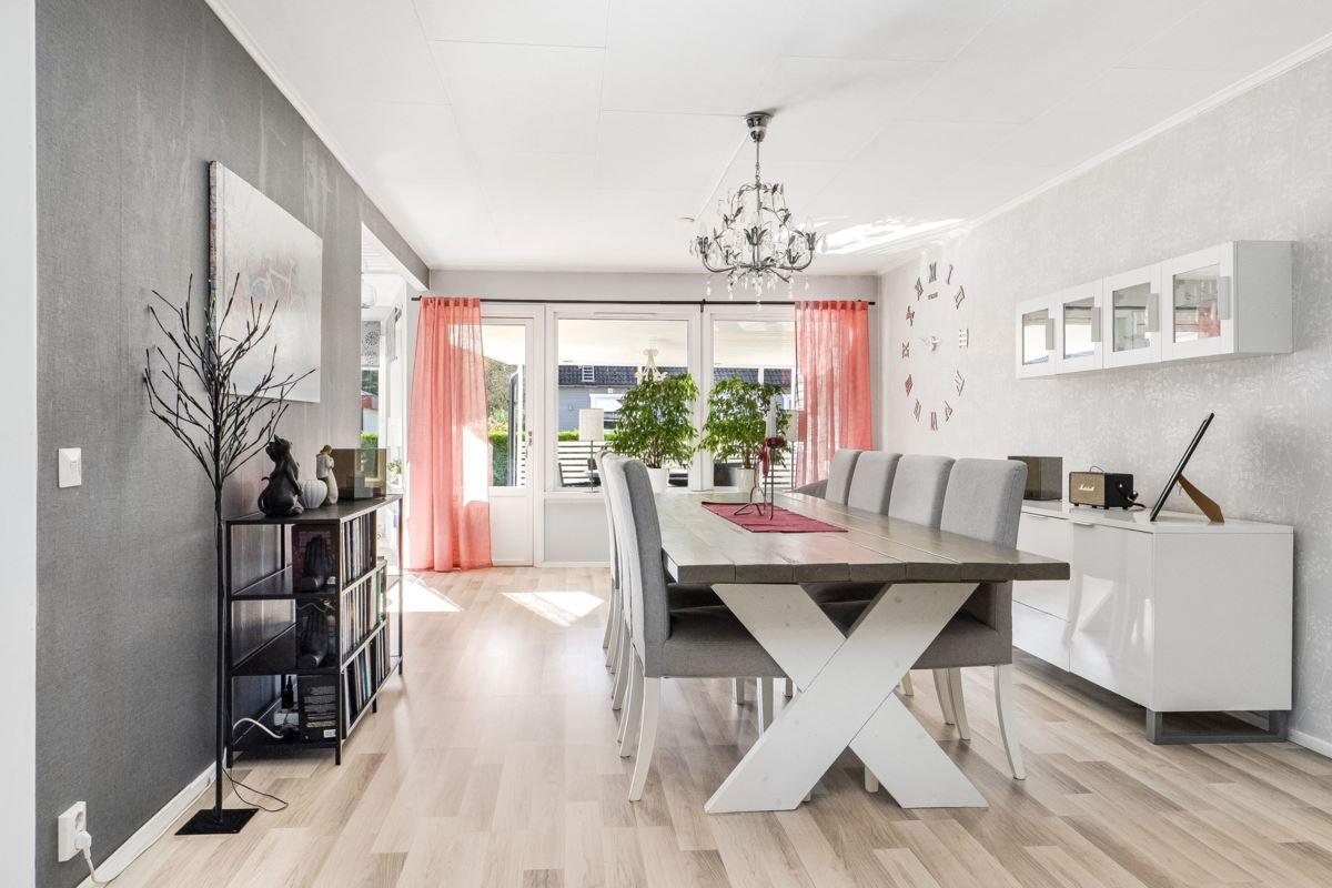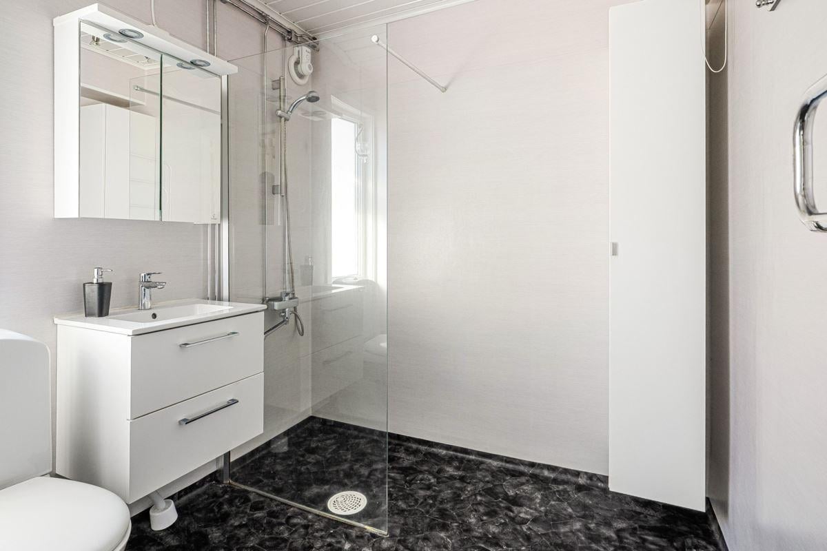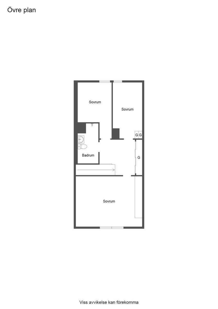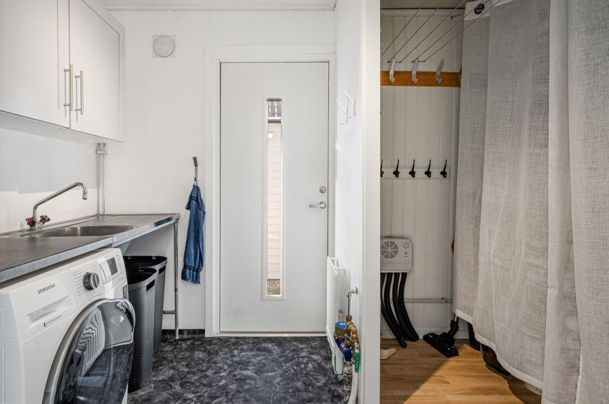 Entréplanet rymmer kök, två sovrum, duschrum och tvättstuga. Vidare finns matrum och vardagsrum i öppen planlösning. På det övre planet finns tre sovrum och ett duschrum. Fiber finns installerat i bostaden.