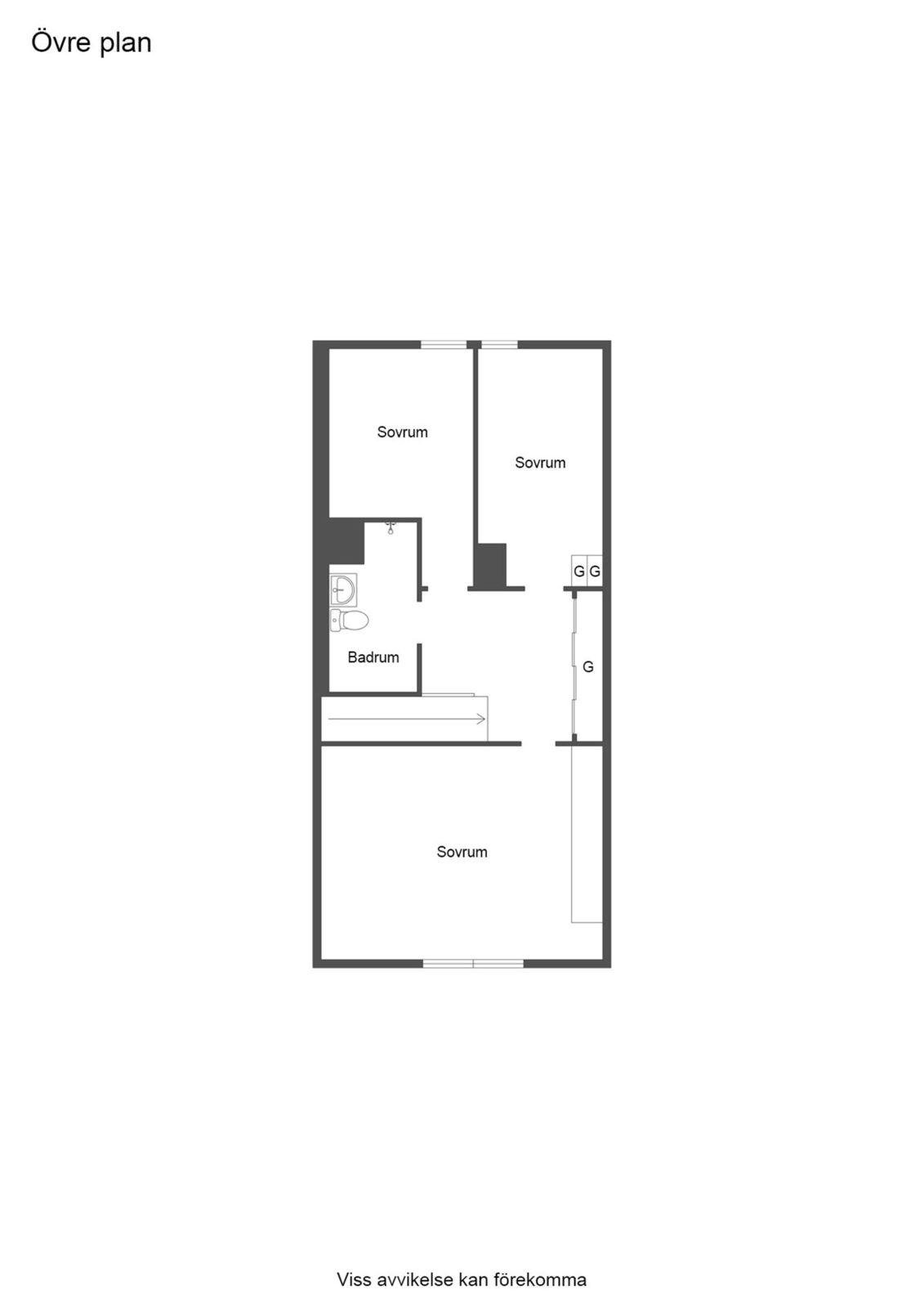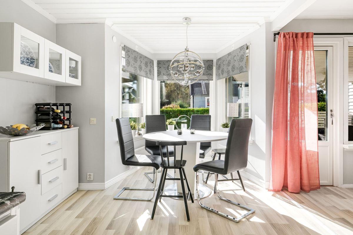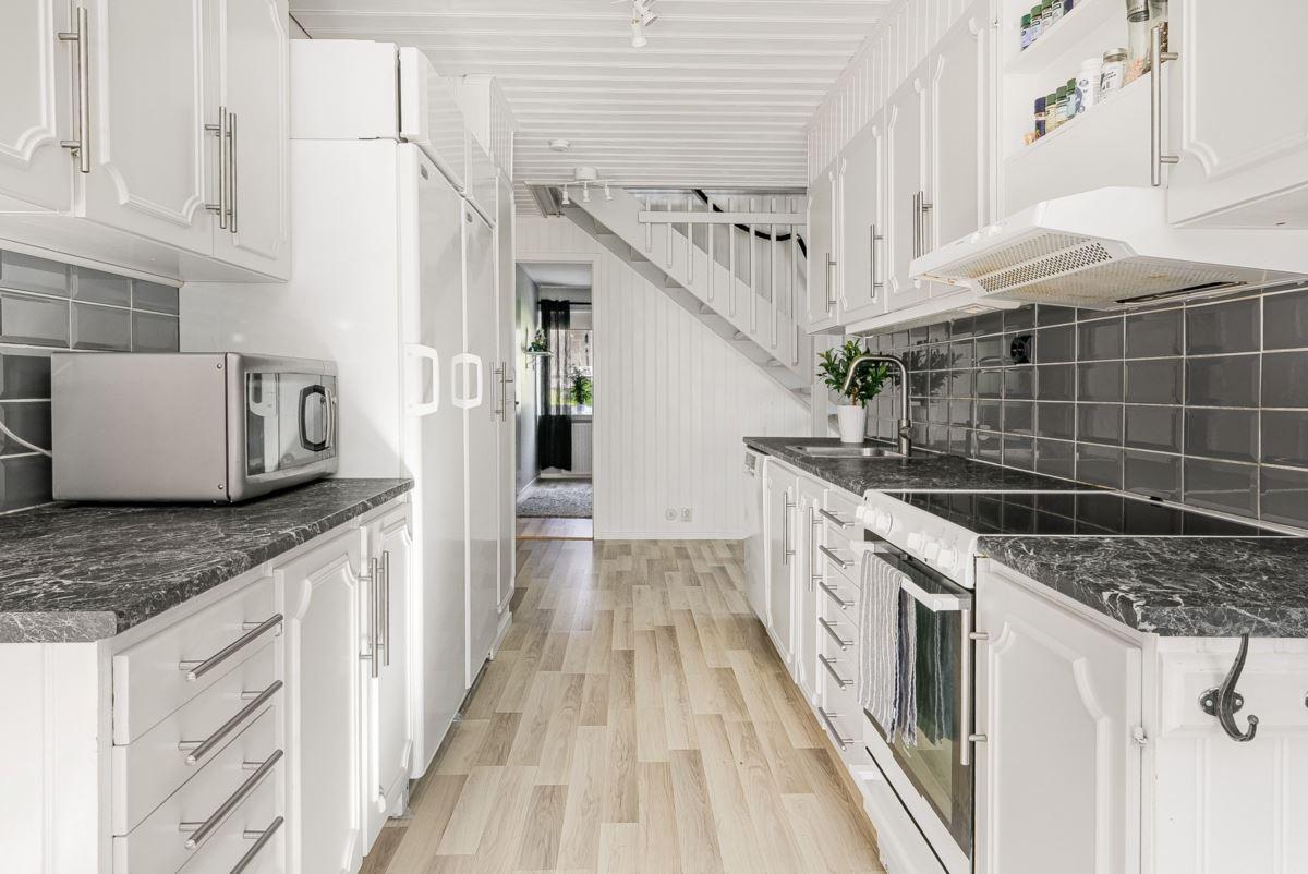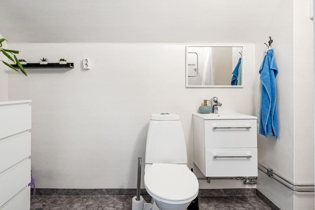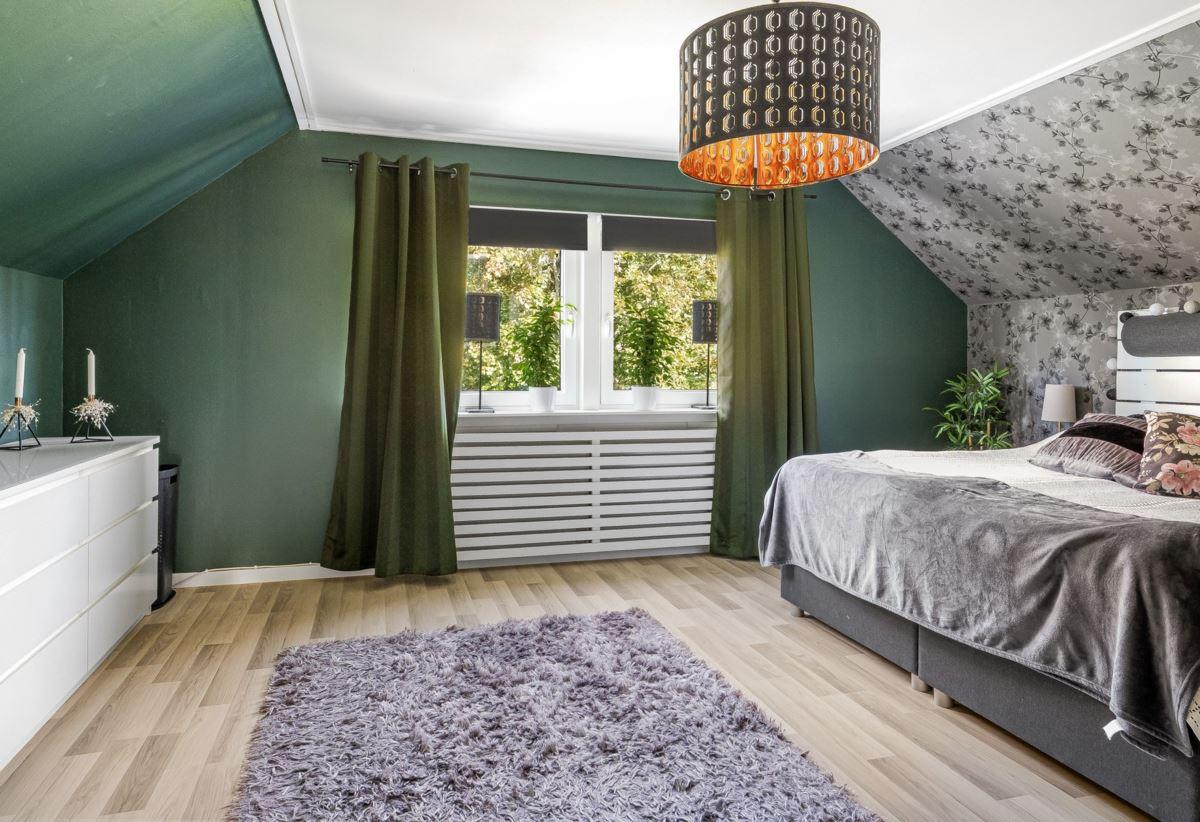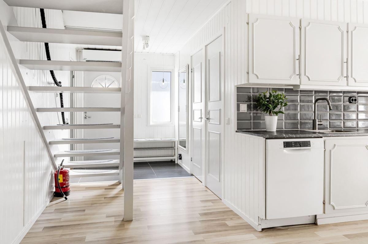 Entréplanet rymmer kök, två sovrum, duschrum och tvättstuga. Vidare finns matrum och vardagsrum i öppen planlösning. På det övre planet finns tre sovrum och ett duschrum. Fiber finns installerat i bostaden.