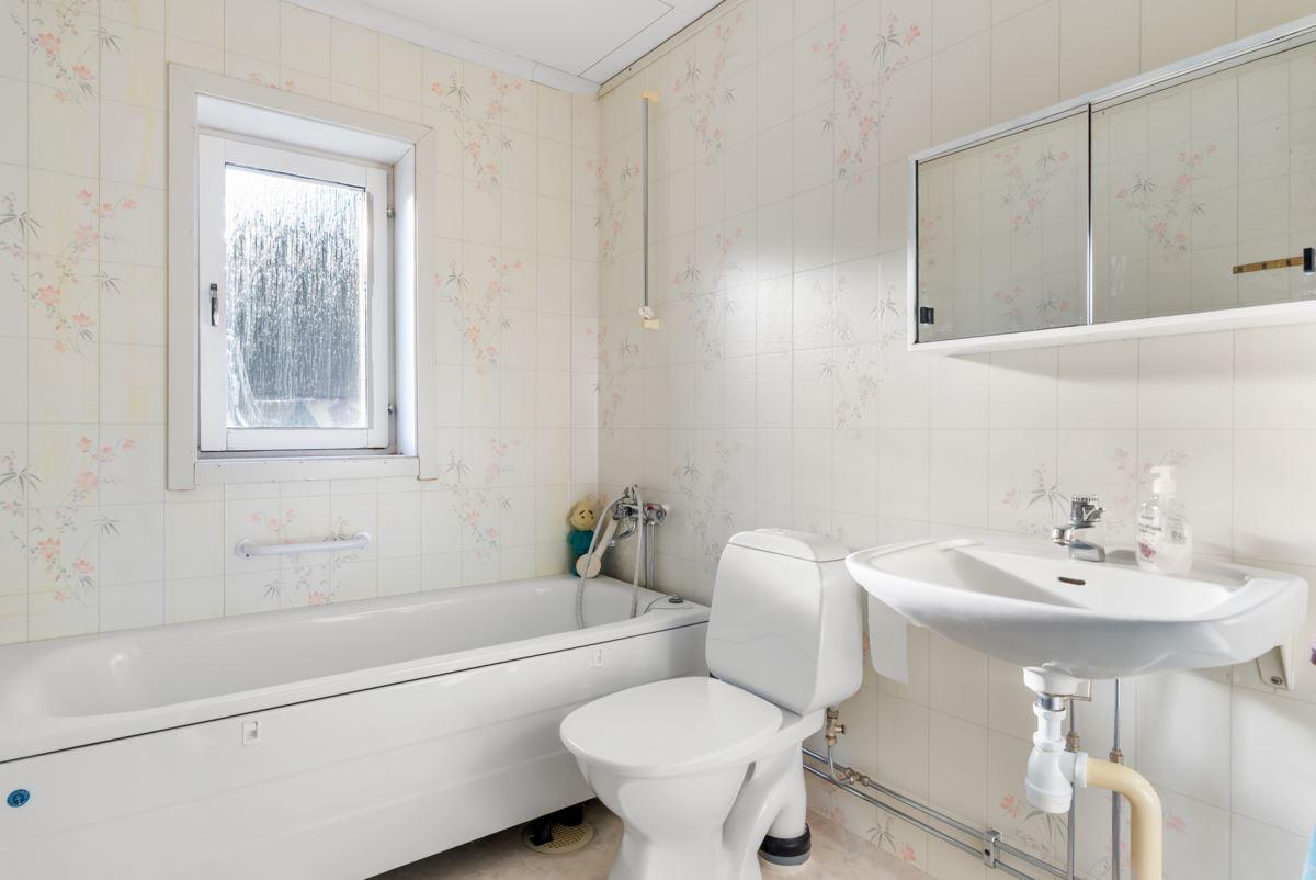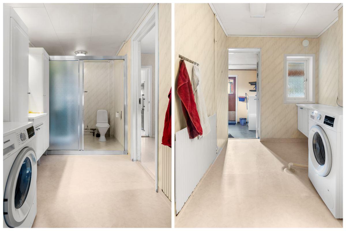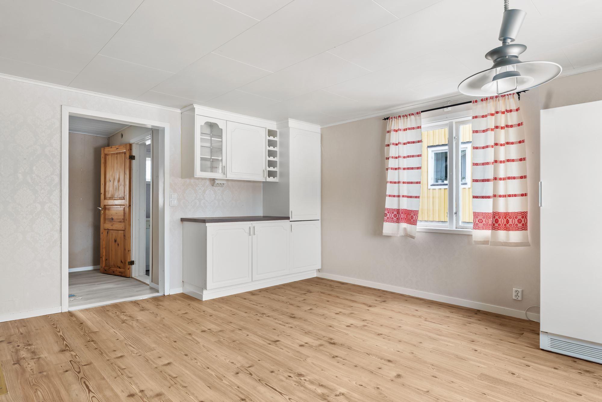 Ingång via takad brokvist till hall med klädförvaring i garderob, ytskikt av laminat på golv och tapetserade väggar, till vänster kommer du in till duschrum utrustat med dusch, toalett och tvättställ, ytskikt av plastmatta på golv och väggar. Rakt fram från hallen hittar du ett rymligt kök med plats för matplats utrustat med köksförvaring spis, vedspis, diskmaskin, tvättställ, kyl och frys, ytskikt av laminat på golv, tapetserade väggar samt kakel ovan arbetsytor.
