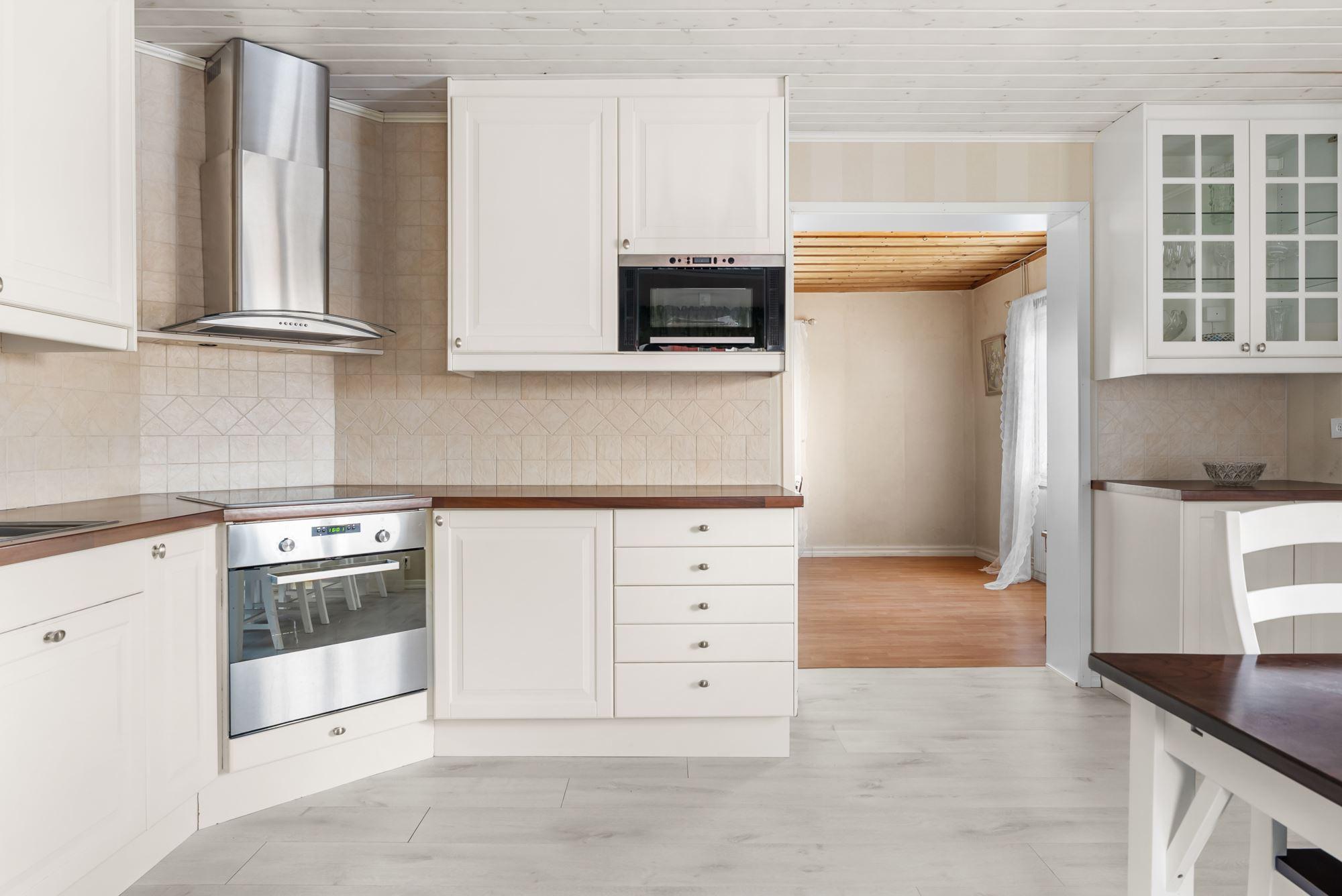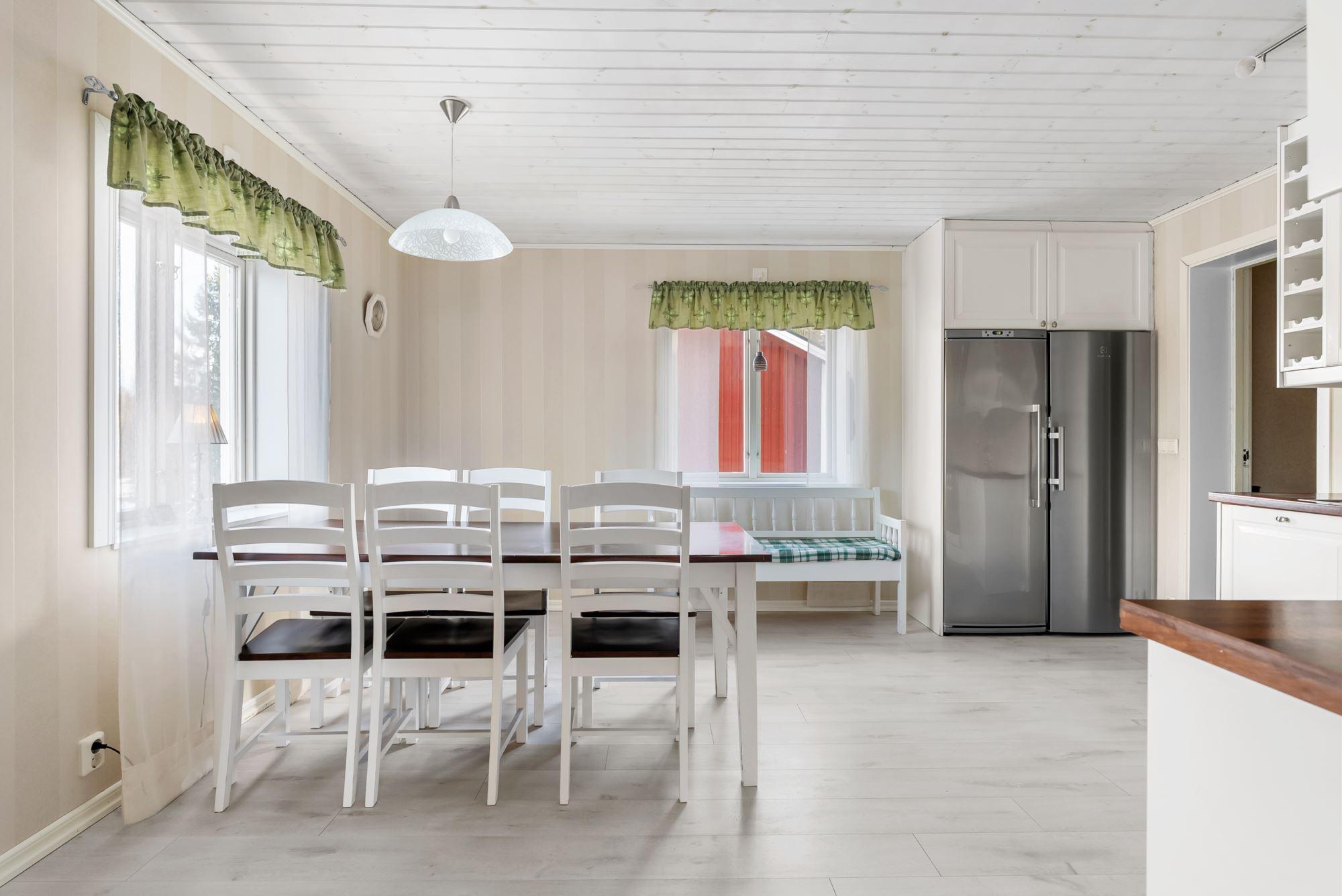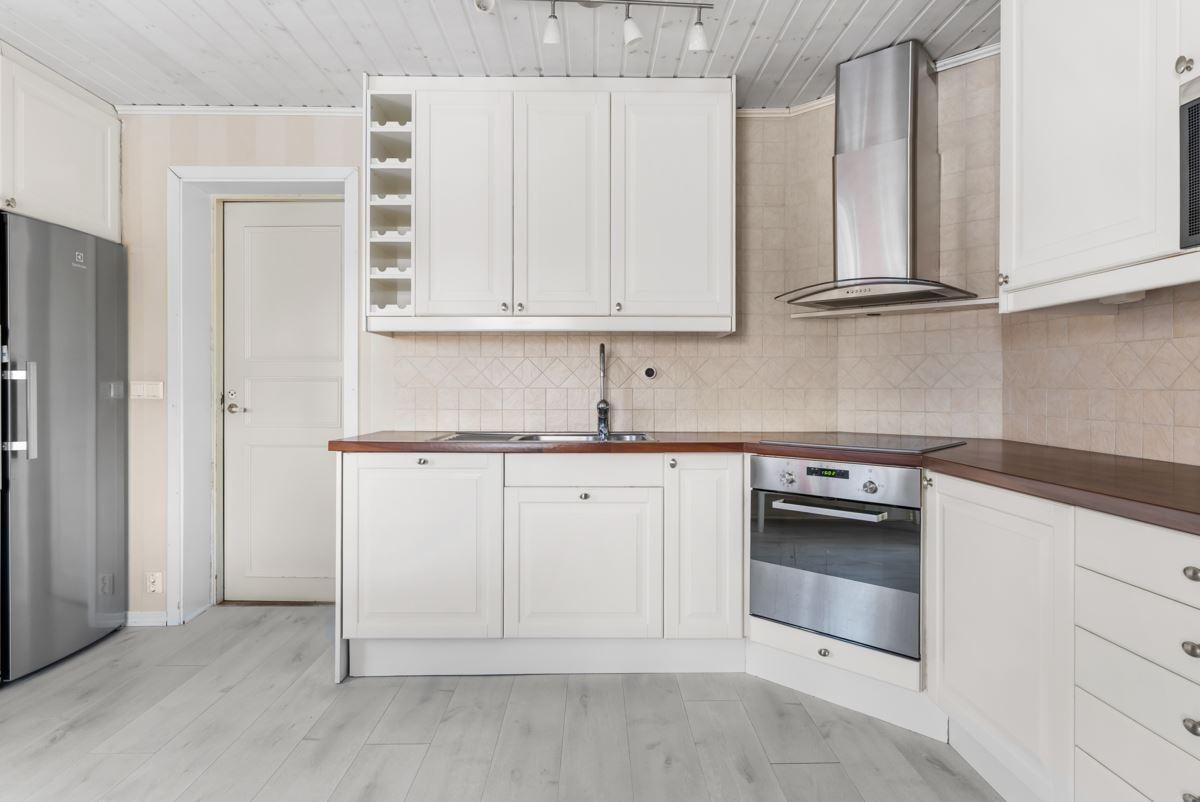 Ingång via takad brokvist till hall med klädförvaring i garderob, ytskikt av laminat på golv och tapetserade väggar, till vänster kommer du in till duschrum utrustat med dusch, toalett och tvättställ, ytskikt av plastmatta på golv och väggar. Rakt fram från hallen hittar du ett rymligt kök med plats för matplats utrustat med köksförvaring spis, vedspis, diskmaskin, tvättställ, kyl och frys, ytskikt av laminat på golv, tapetserade väggar samt kakel ovan arbetsytor.