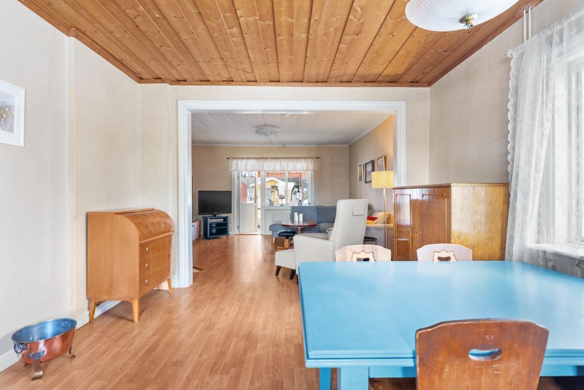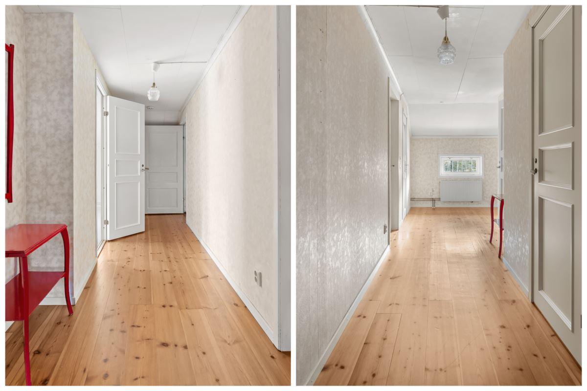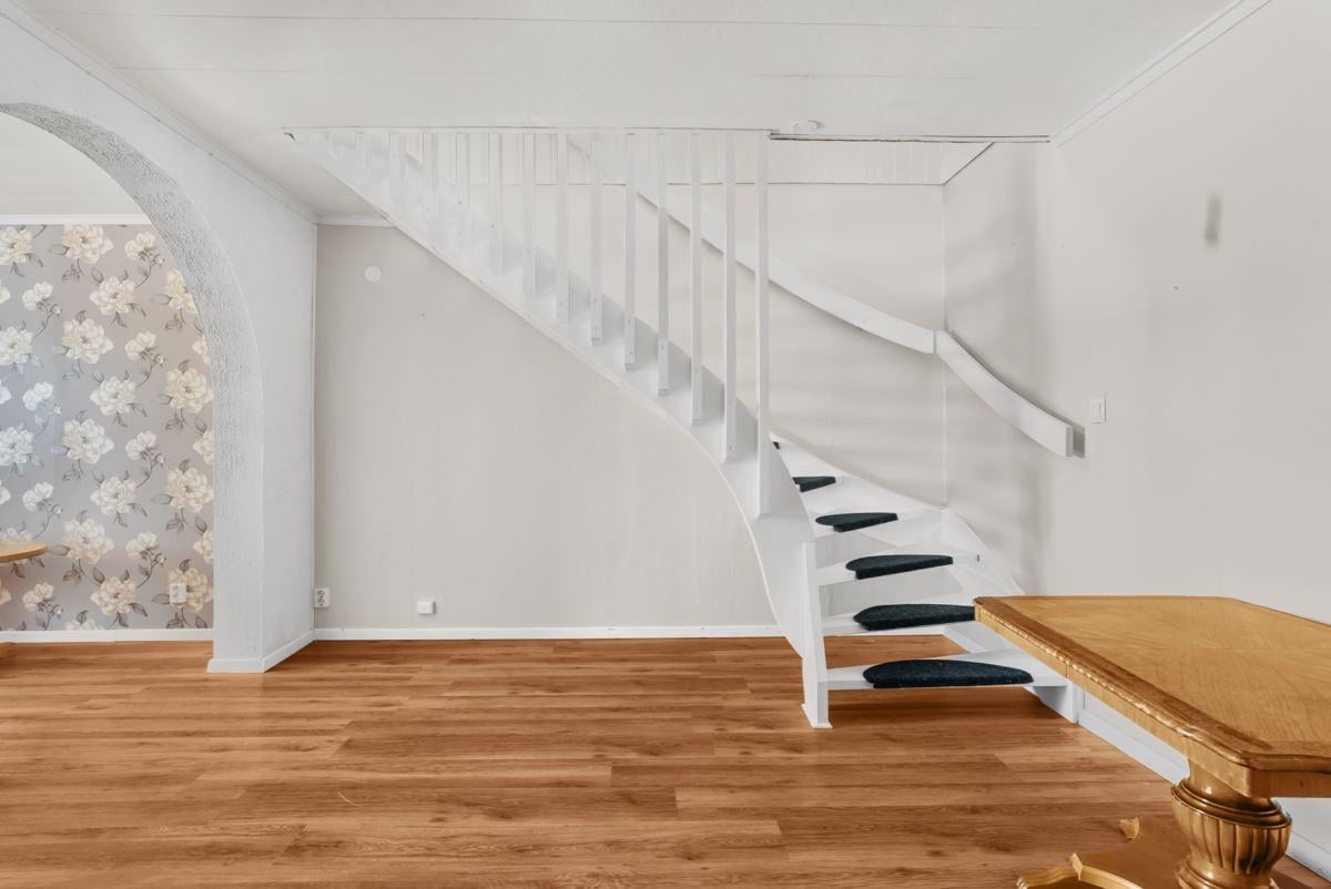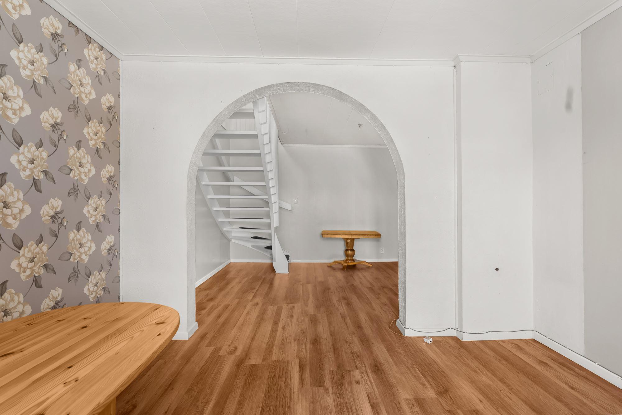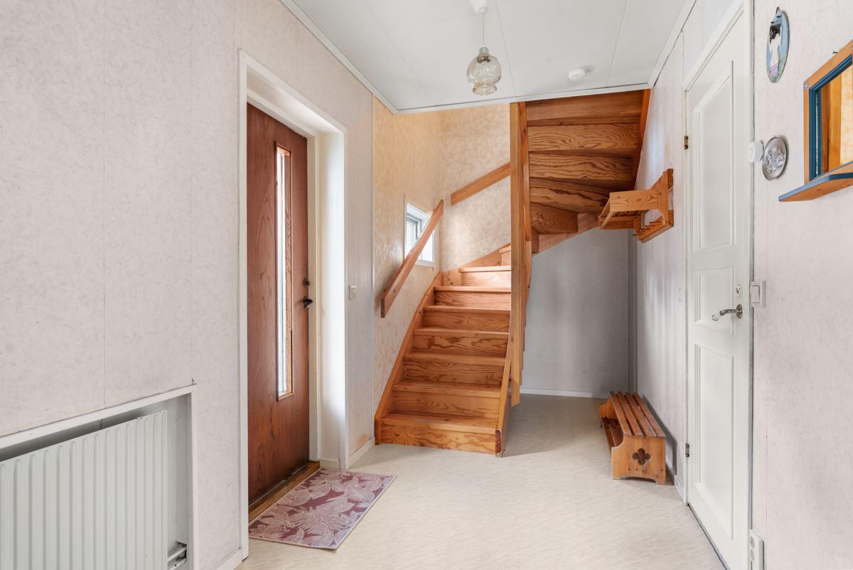 Till höger från hall når du vardagsrum med ytskikt av laminatgolv och tapetserade väggar samt trappa upp till övre plan direkt till allrum med ytskikt av trägolv och tapetserade väggar samt ett sovrum med ytskikt av heltäckningsmatta på golv och tapetserade väggar.