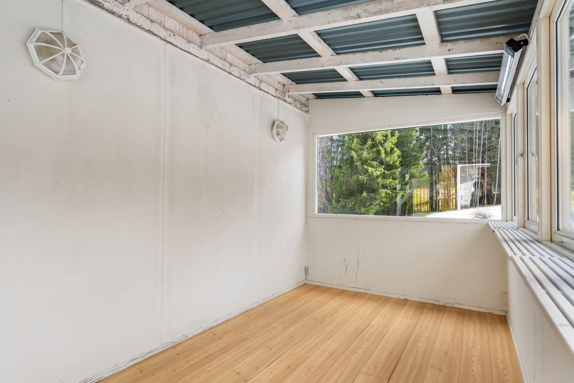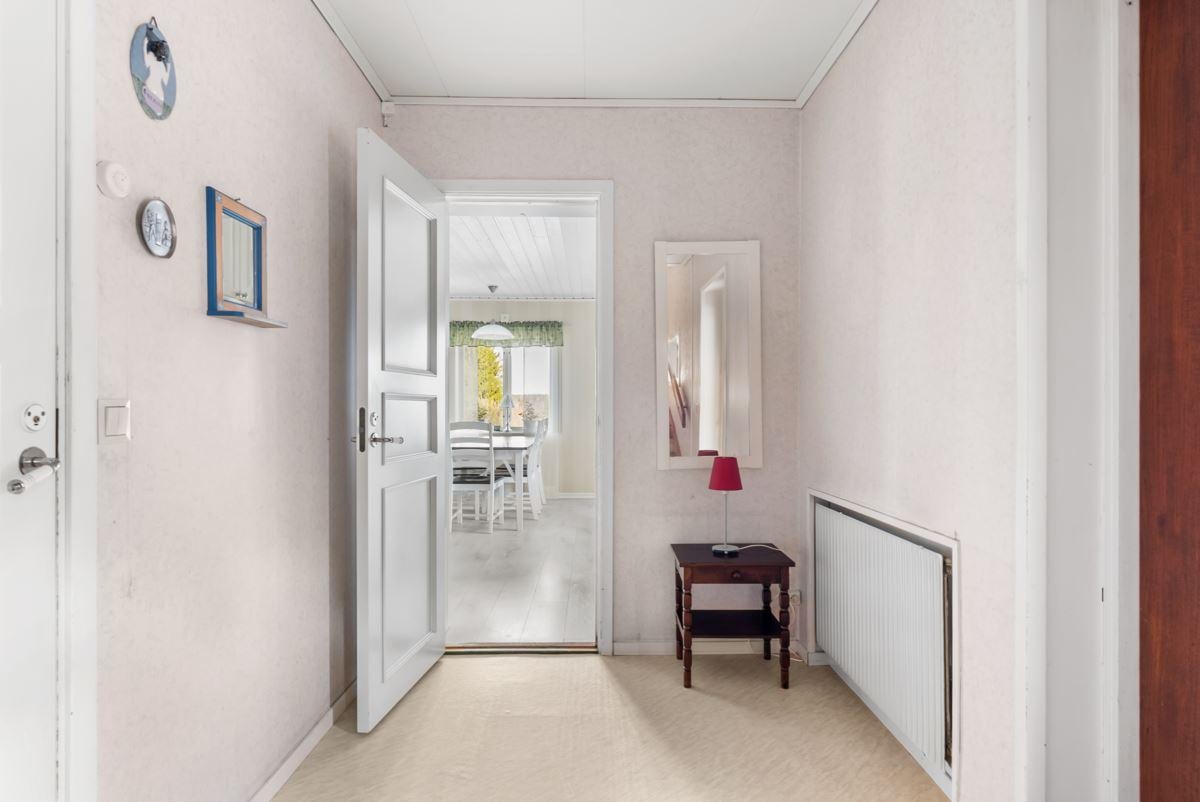 Vid entrédörren finns ett delvis inglasat uterum med plats för matgrupp.