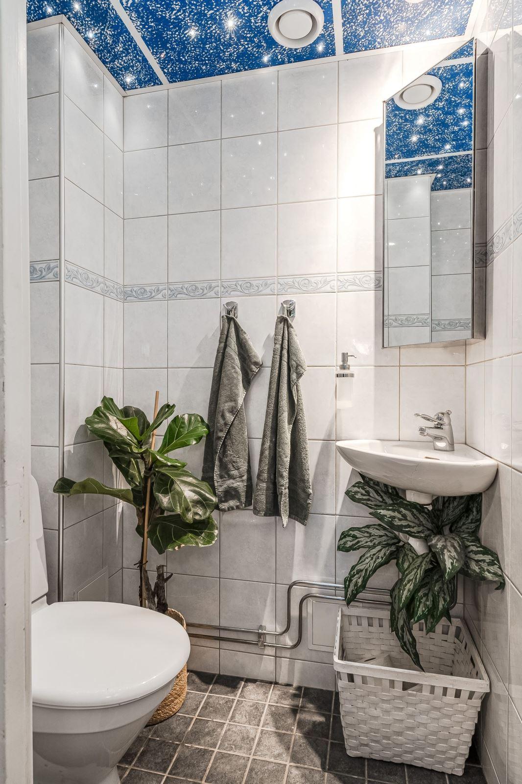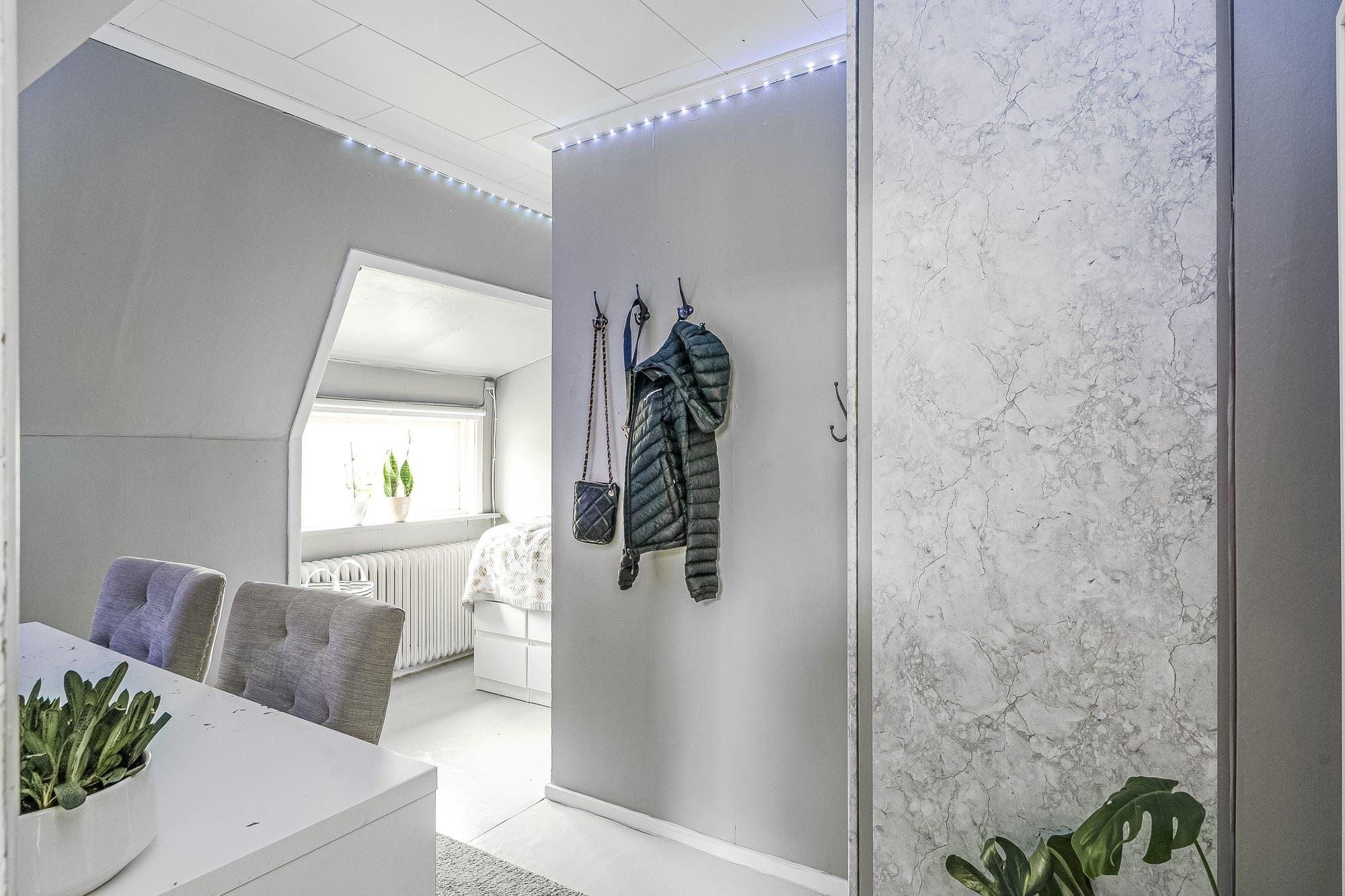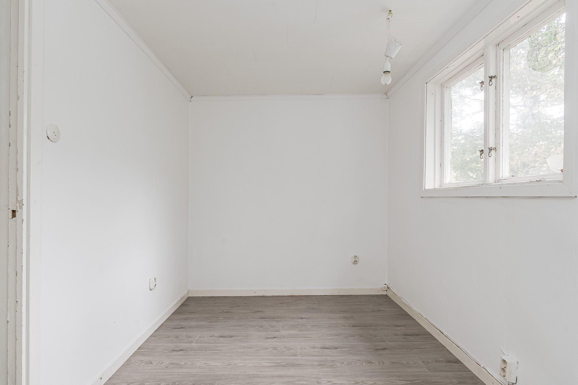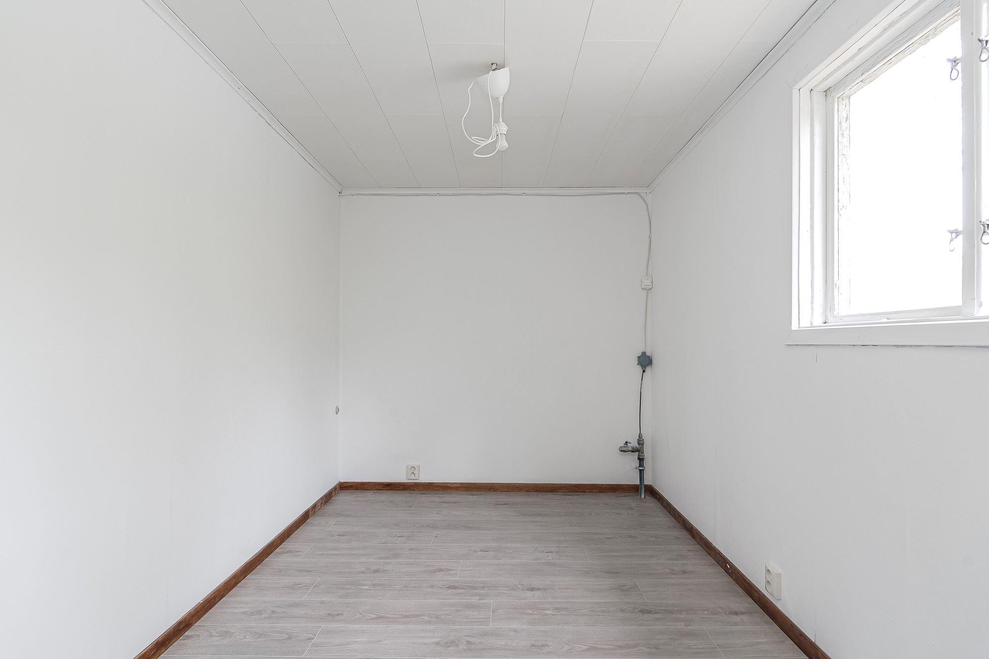 Garage med port för en bil vidbyggt med isolerat och eluppvärmt gäststuga med tre rum, ytskikt av laminat på golv och målad vävtapet på golv. Garderobsförvaring i ett av rummen.