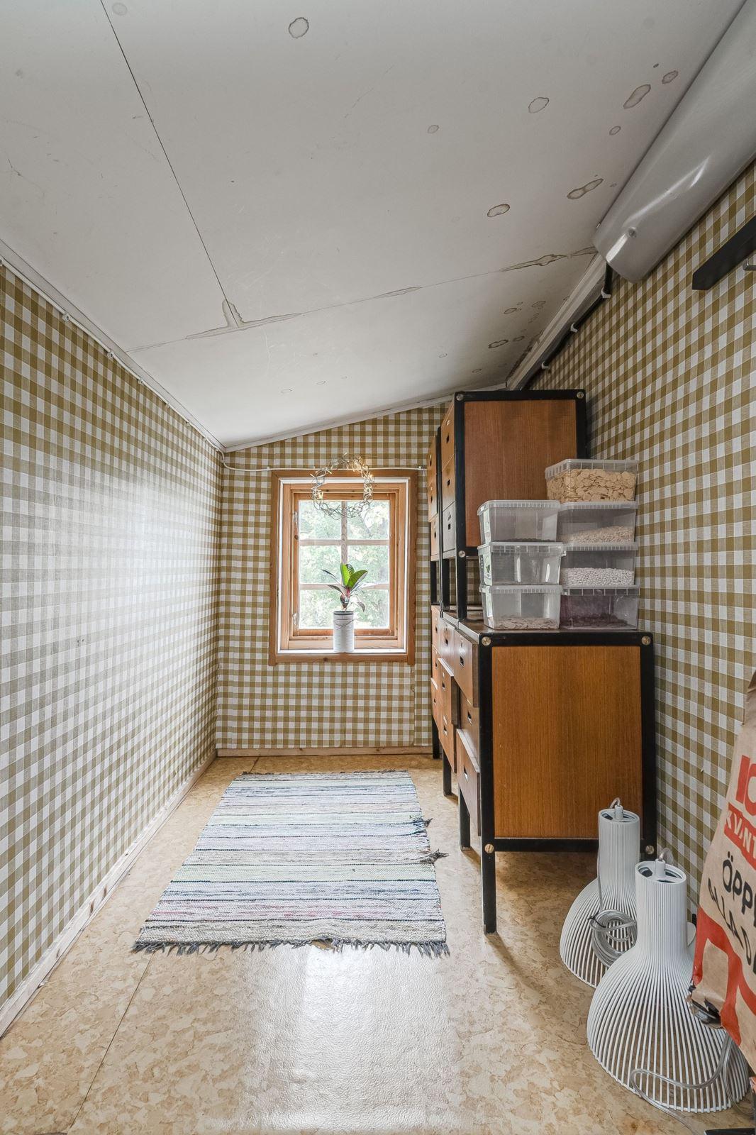Gäststuga/lekstuga uppförd i trä med plåttak innhållande ett rum med öppen spis (okänt skick), ytskikt av plastmatta på golv och tapetserade väggar.