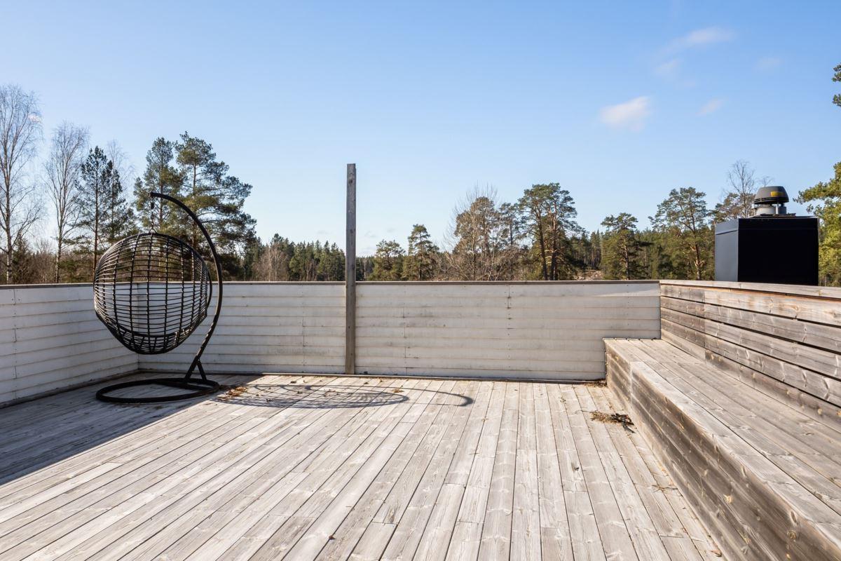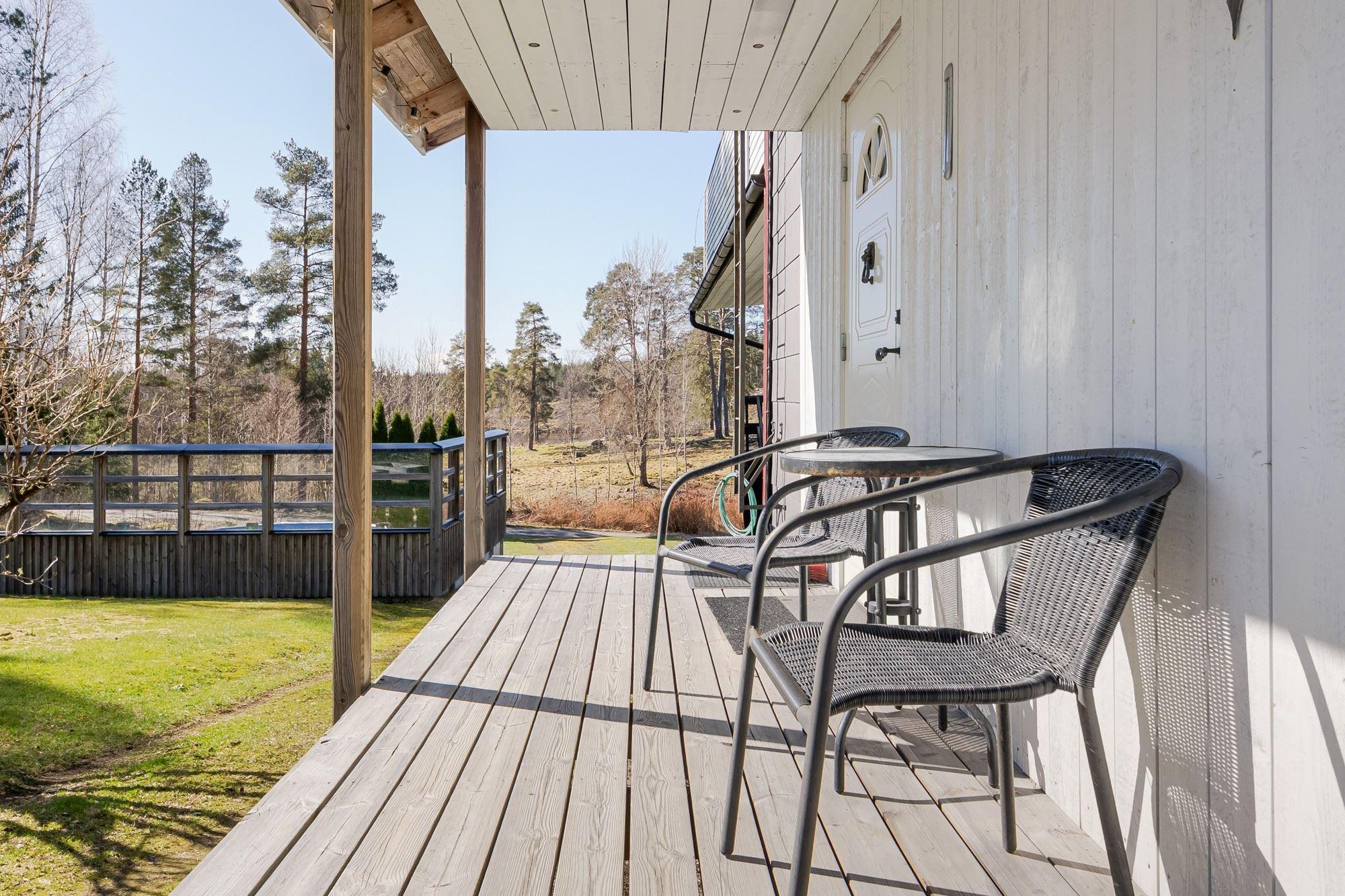 Det generösa altandäcket blir en naturlig samlingsplats där du kan njuta av lugnet och omgivningarna. Här finns gott om plats med både fristående garage och garage i suterrängplan.