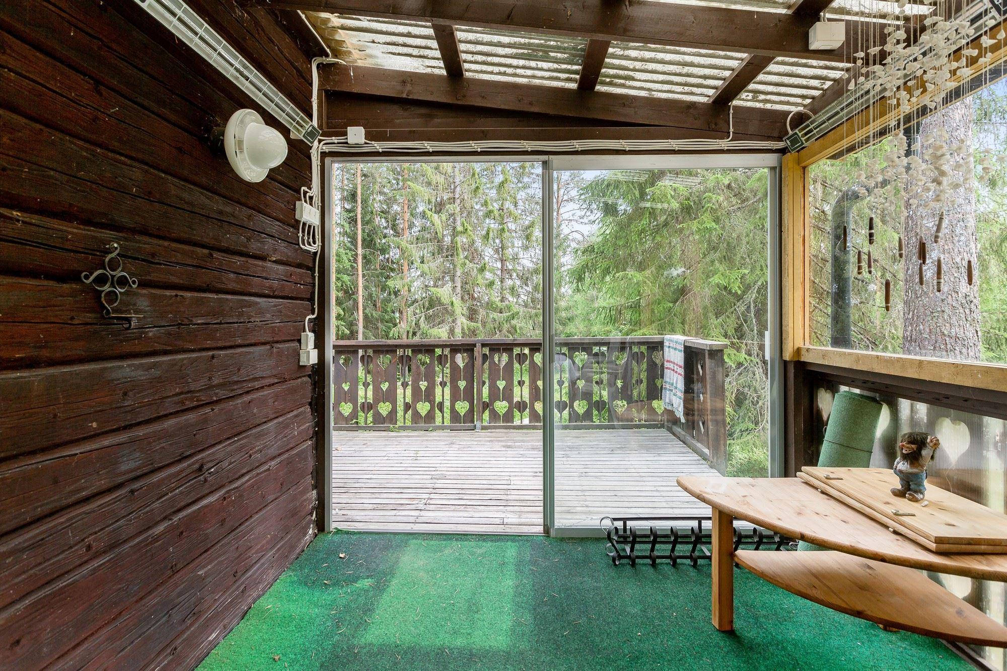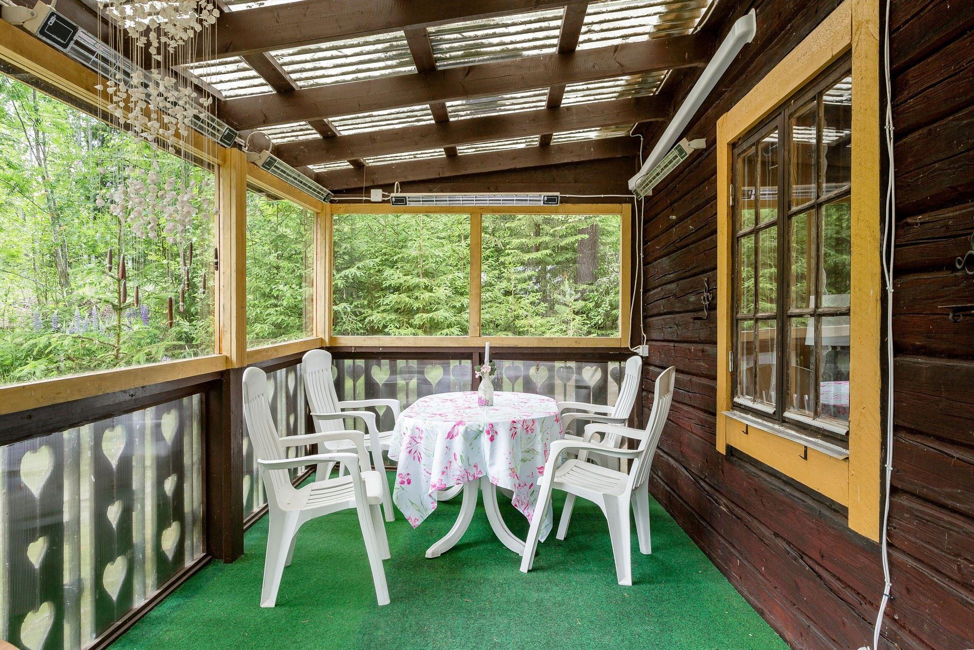 Från bostaden nås en stor altan med fin utsikt över den egna tomten och den omgivande skogen – en perfekt plats för morgonkaffet, sommarens middagar eller avkopplande stunder i solen. Dessutom finns ett inglasat uterum med plats för matgrupp, vilket förlänger utesäsongen och skapar en skyddad miljö för umgänge oavsett väder.