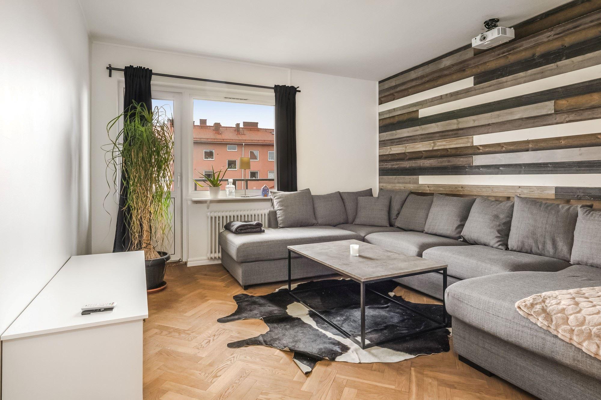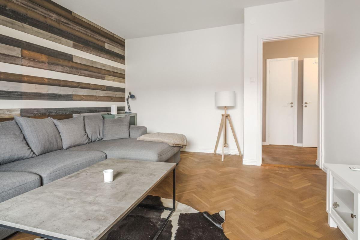- Vardagsrum med vackert parkettgolv och utgång till balkong i SV-läge med utsikt över den rofyllda innergården