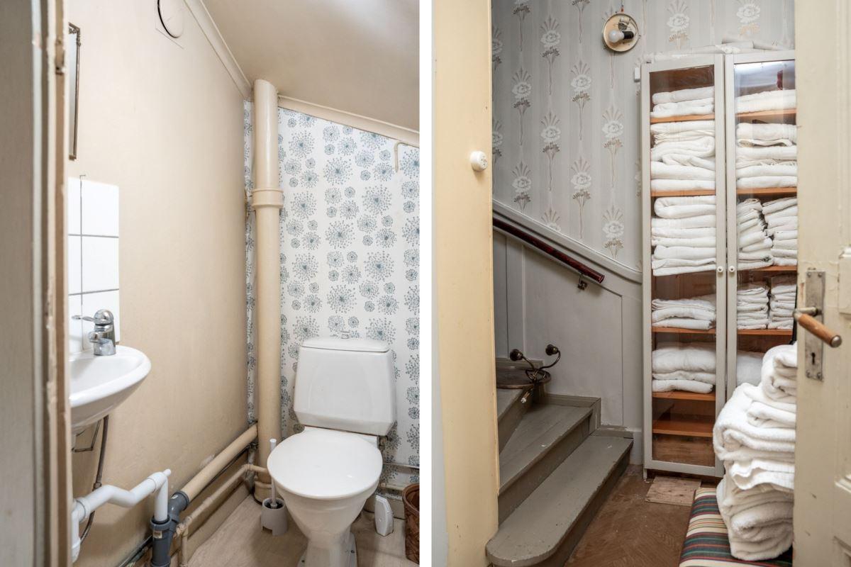 Källarplan: Källarplanet rymmer pannrum, tvättstuga med dubbla tvättmaskiner och torktumlare, torkrum, bastu samt generösa förrådsutrymmen. Här finns allt som krävs för en fungerande drift av pensionatet eller ett större hushåll.