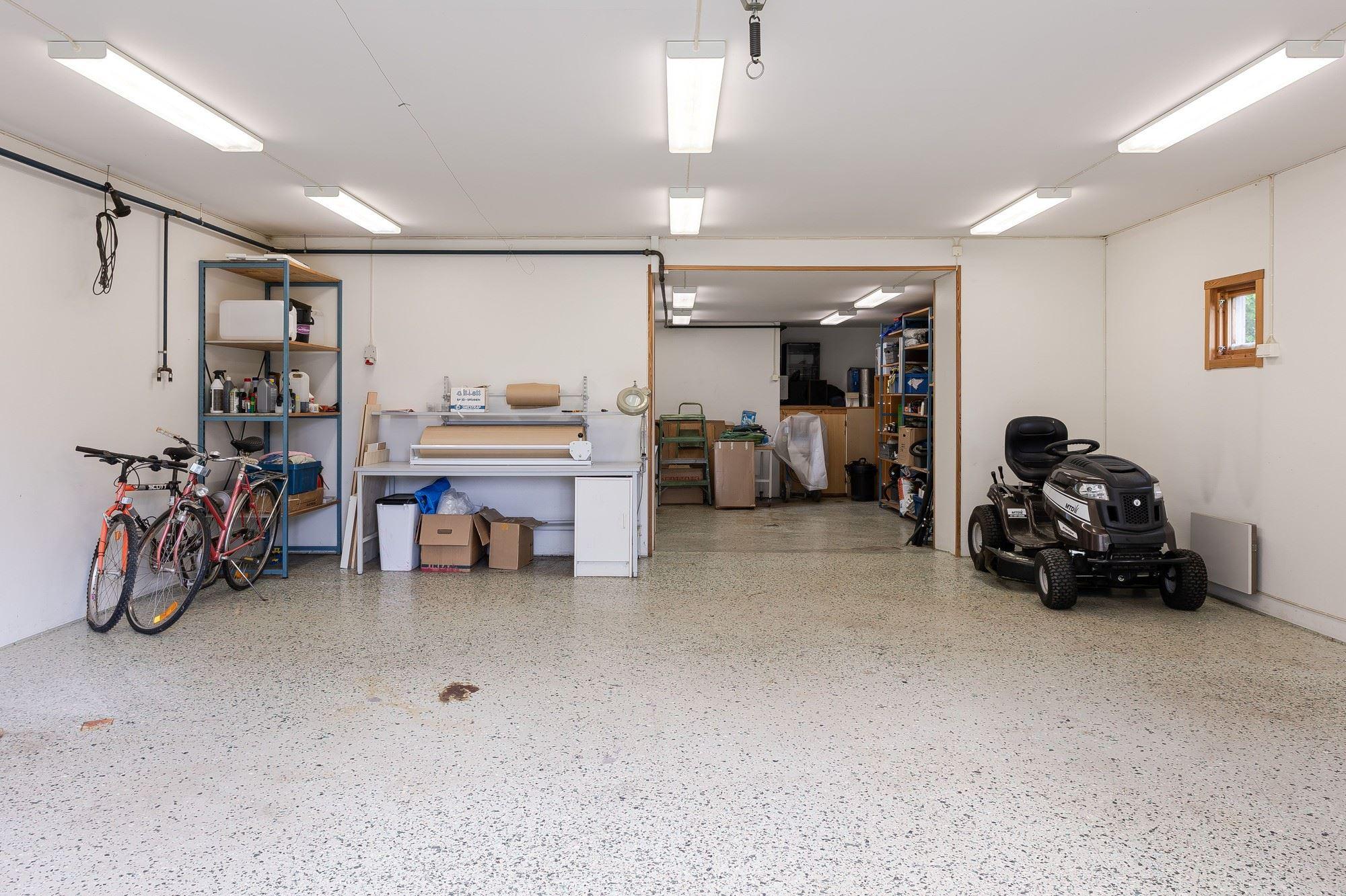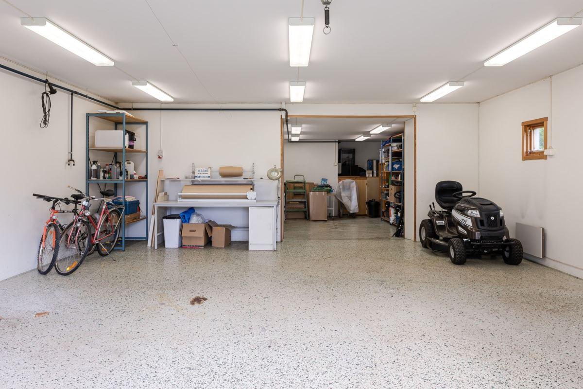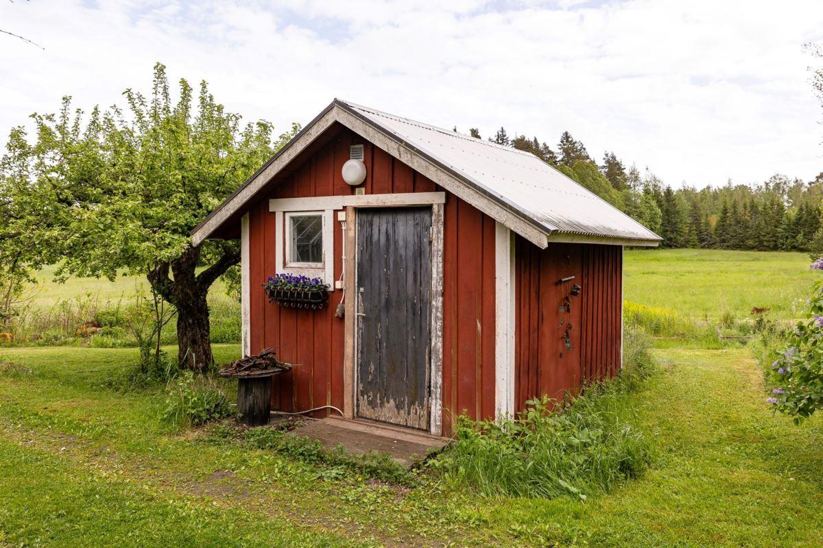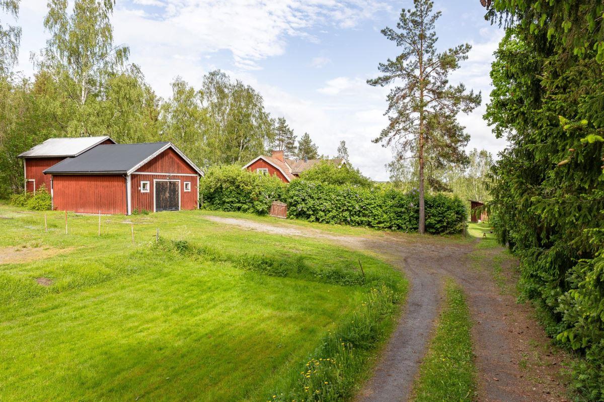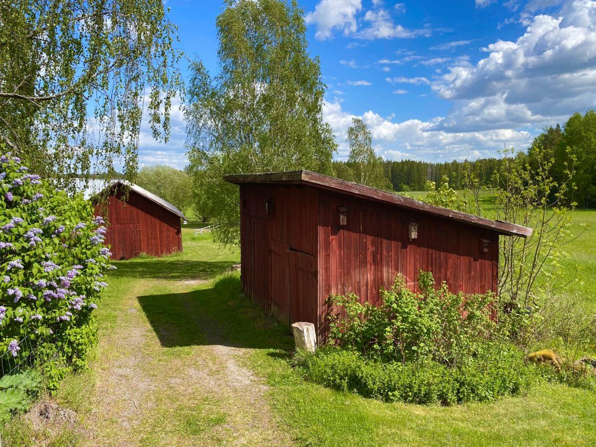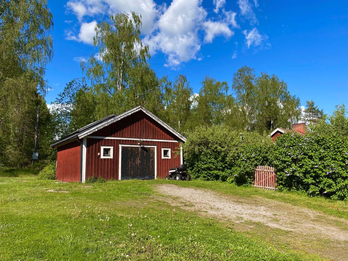 Isolerat garage/gårdsverkstad: Uppförd år 1995 med träregelstomme på hel gjuten platta på mark. Utvändigt fasad med stående träpanel och tak belagt med korrugerad plåt. Byggnaden innehåller två avdelningar i nedre planet, dels ett garage/verkstad med rörledningssystem för tryckluft, dels ett inre förvaringsutrymme. I övre planet finns ett kallförråd. Biarea 66 kvm i nedre planet och 26 kvm i övre planet (areauppgifter från uppmätning inför försäljningen).