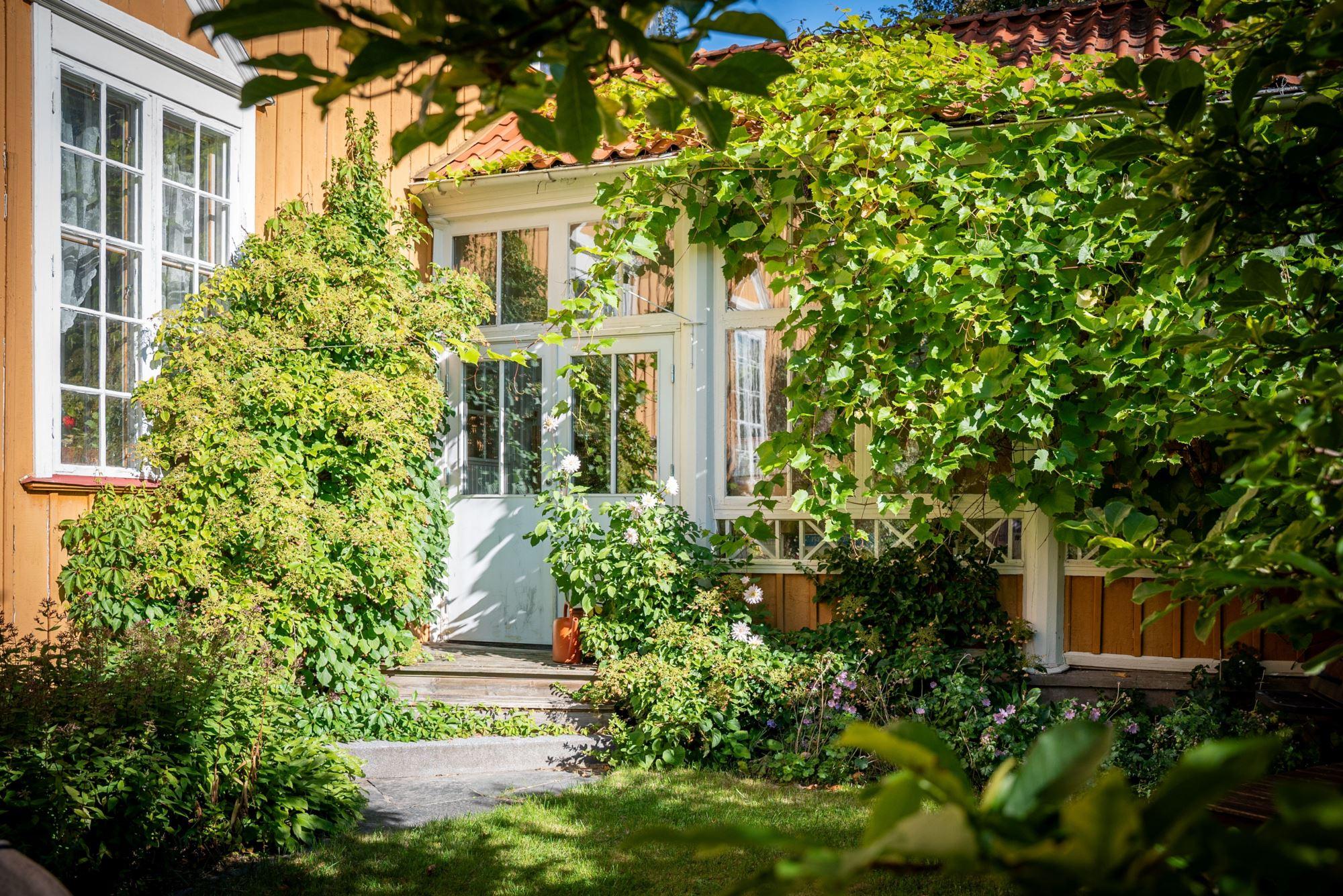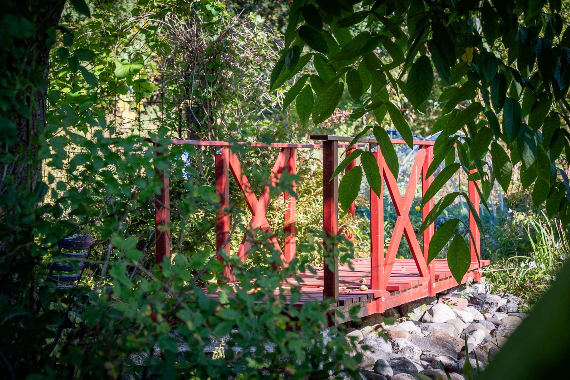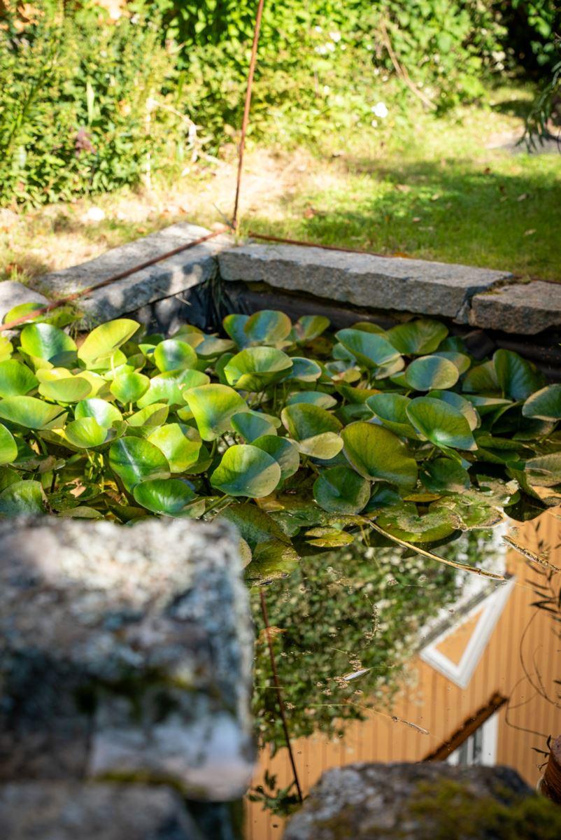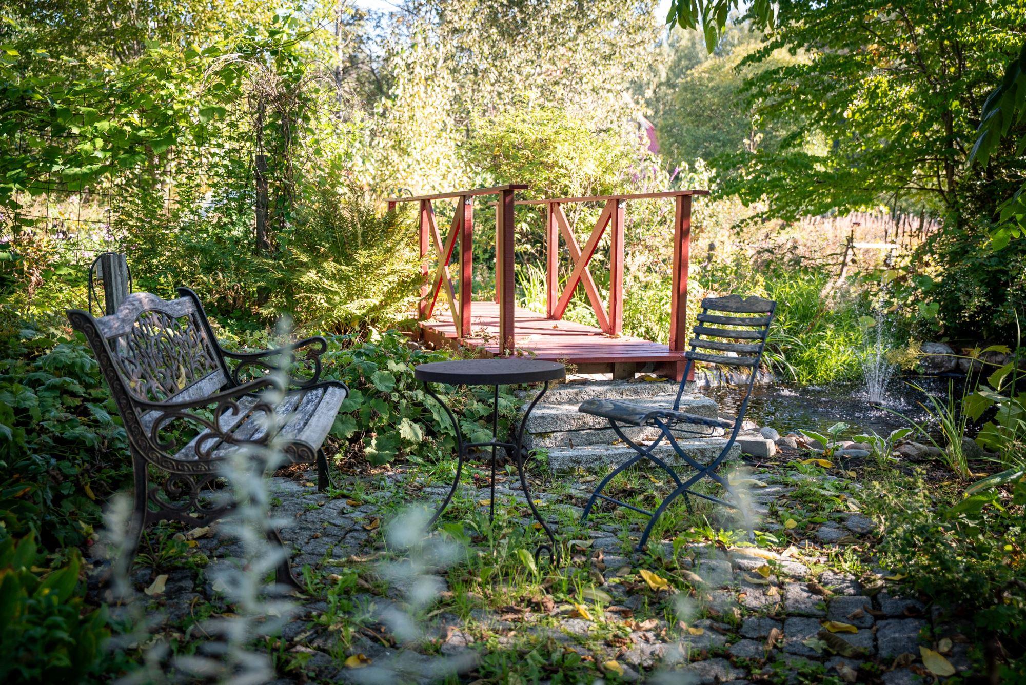 Den generösa tomten är en oas i sig – en lummig och rogivande miljö med flera uteplatser där du kan följa solens gång. Här finns dessutom en charmig damm med fontän och bro som ytterligare förstärker den sagolika känslan.