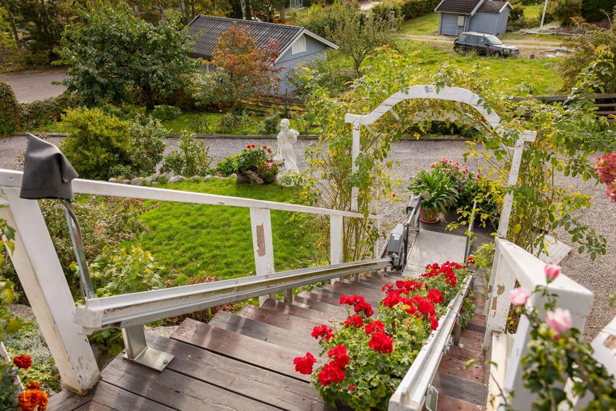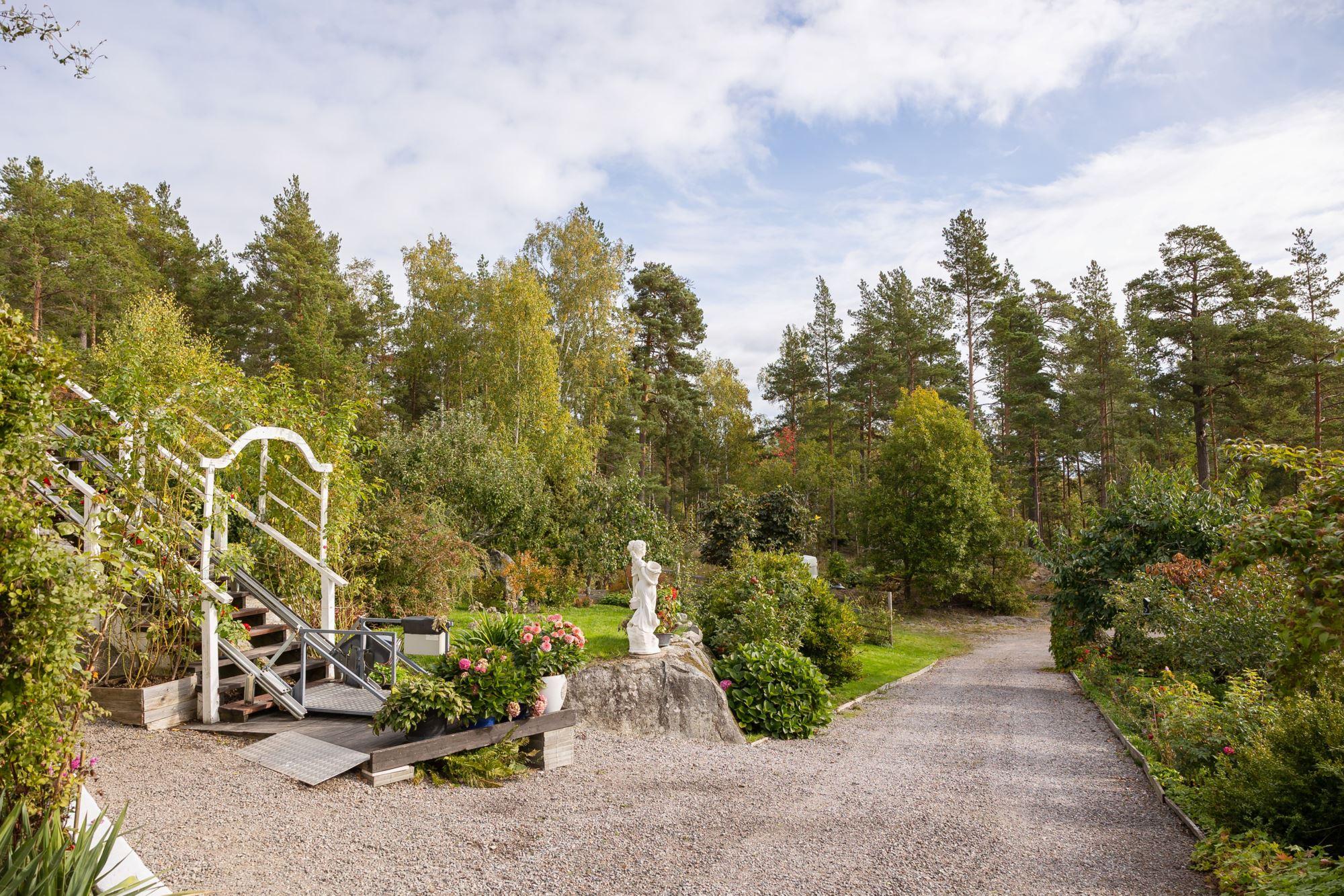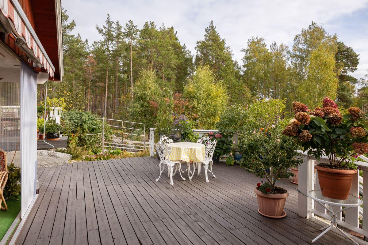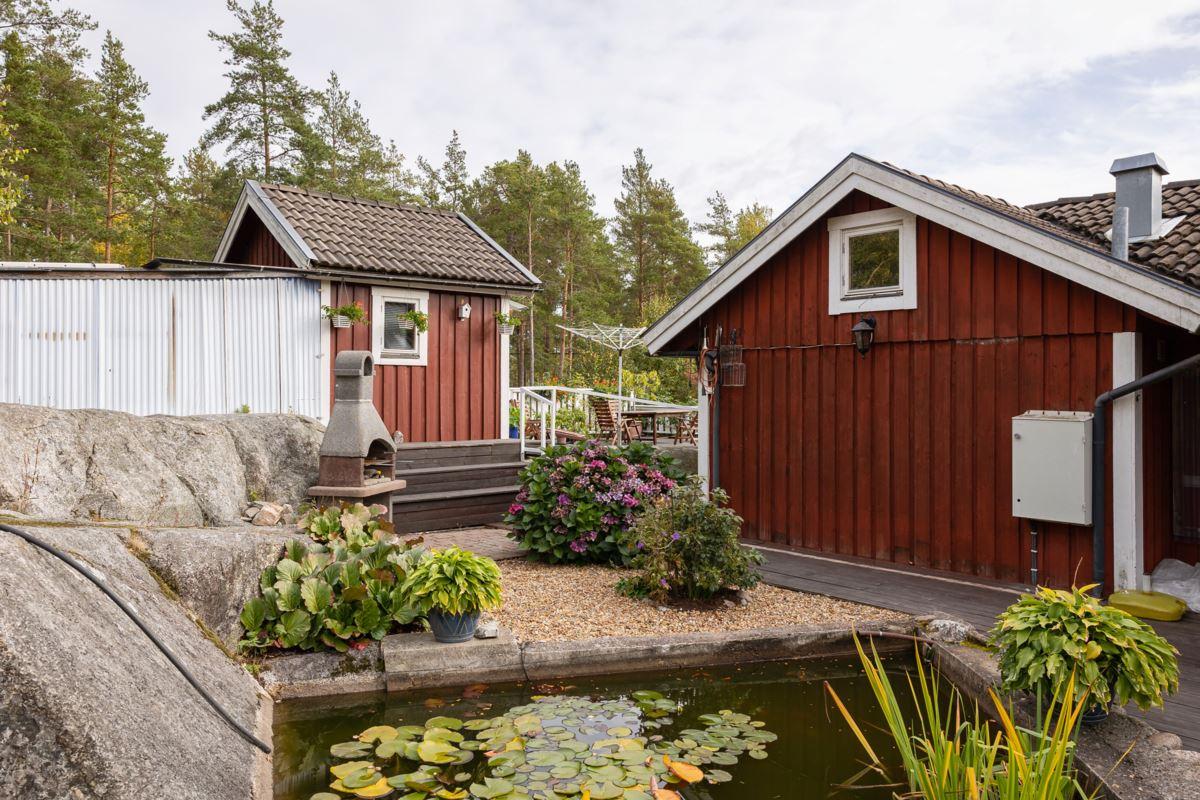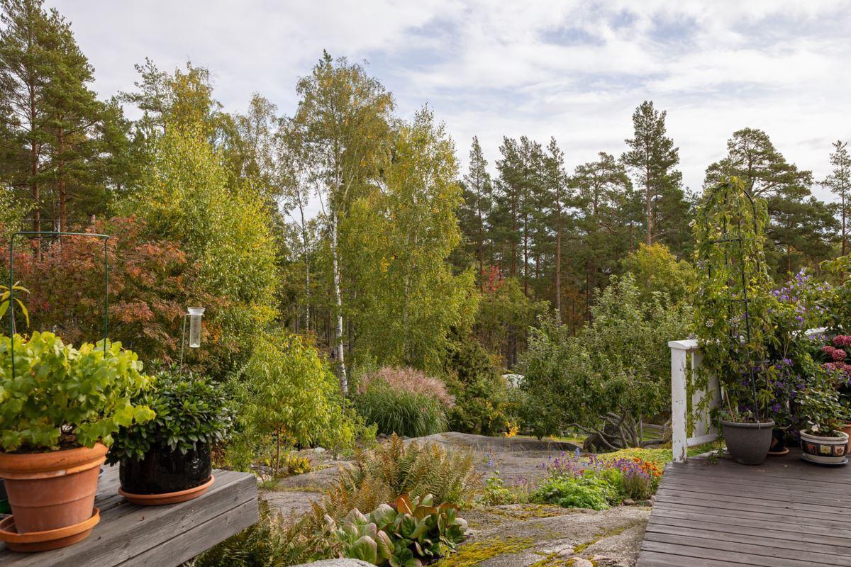 • TomtEnligt fastighetsregistret uppgår tomtens storlek till 1.101 kvm. Lättskött och trivsam sluttningstomt med berget i dagen på flera ställen. Tomten är en hörntomt och angränsar endast en bebodd grannfastighet. På tomten finns gräsytor, många perenna växter, fruktträd, en trevlig fiskdamm samt grusad uppfartsväg. Invid bostadsbyggnaden finns en väl tilltagen altan, delvis under tak.