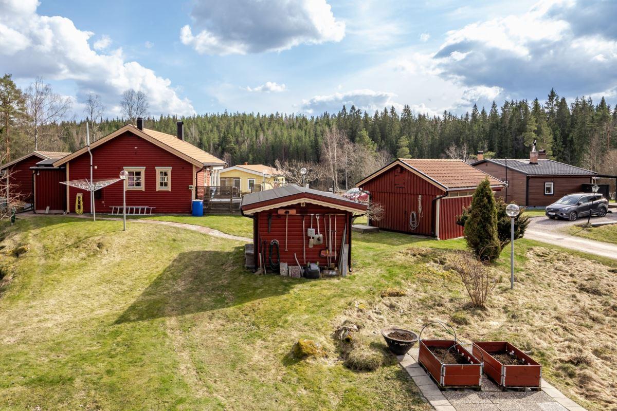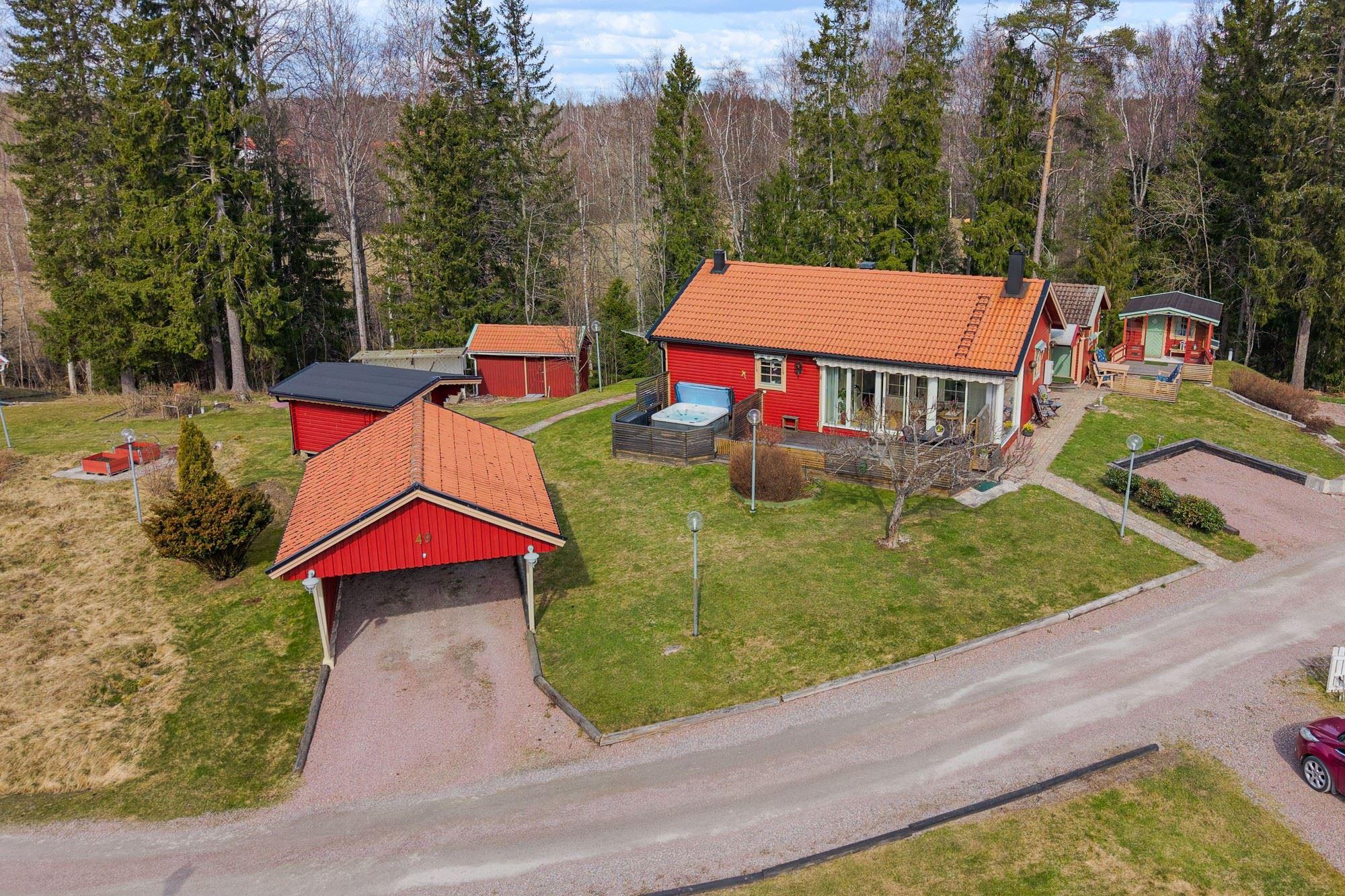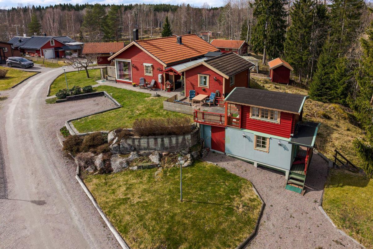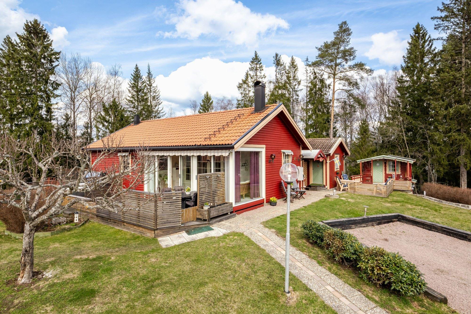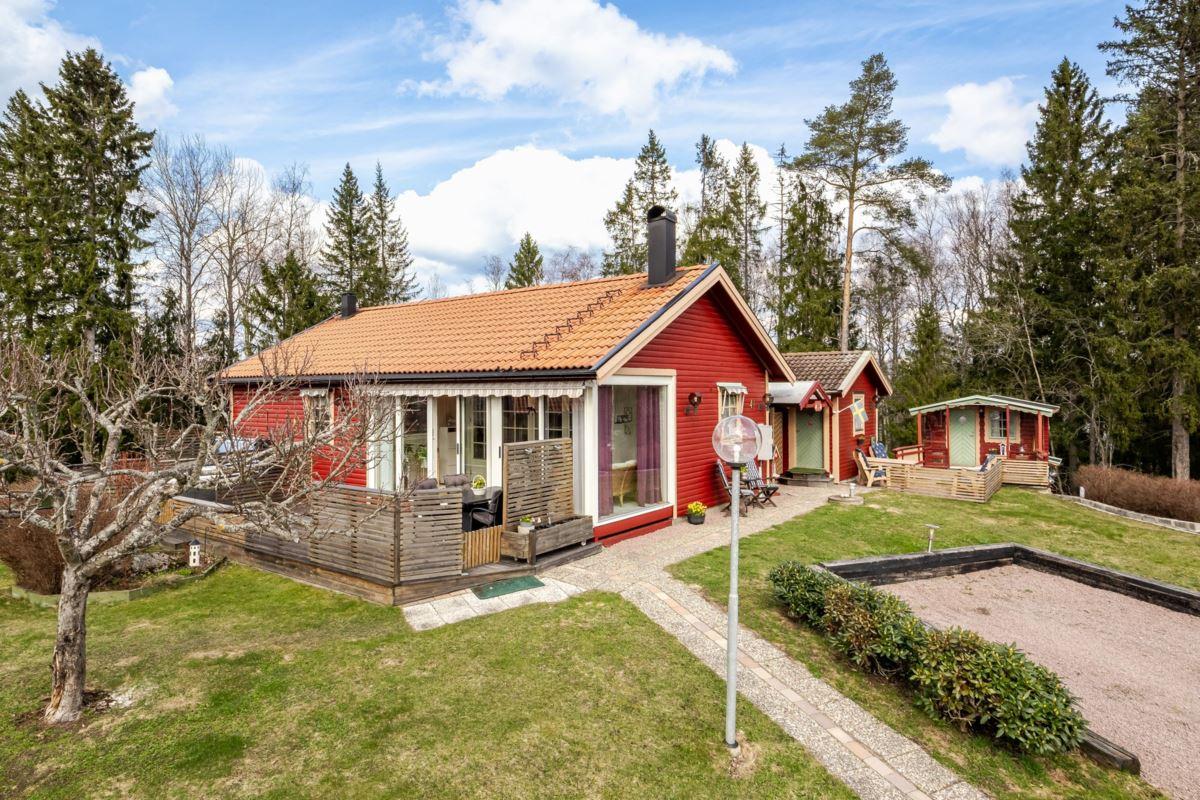 Bostaden erbjuder 3 rok samt en isolerad inglasad altan med vidbyggd terrass där ett härligt spabad finns. Ljust och fint Marbodal-kök, vardagsrum med murad öppen spis samt kassett, duschrum och två sovrum. Från vardagsrummet nås den inglasade altanen. Fiber finns indraget i bostaden. Utöver bostadshuset finns två gäststugor, tvättstuga, vedbod, jordkällare och en carport samt ett dubbelgarage.