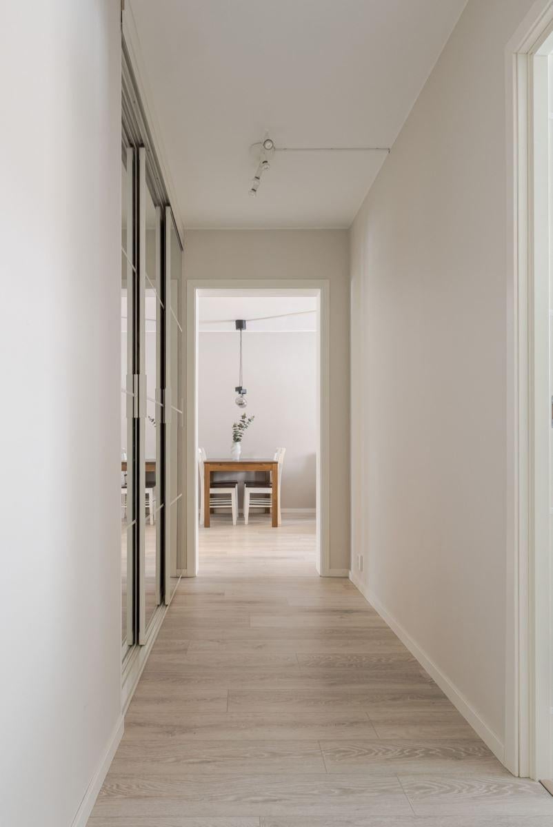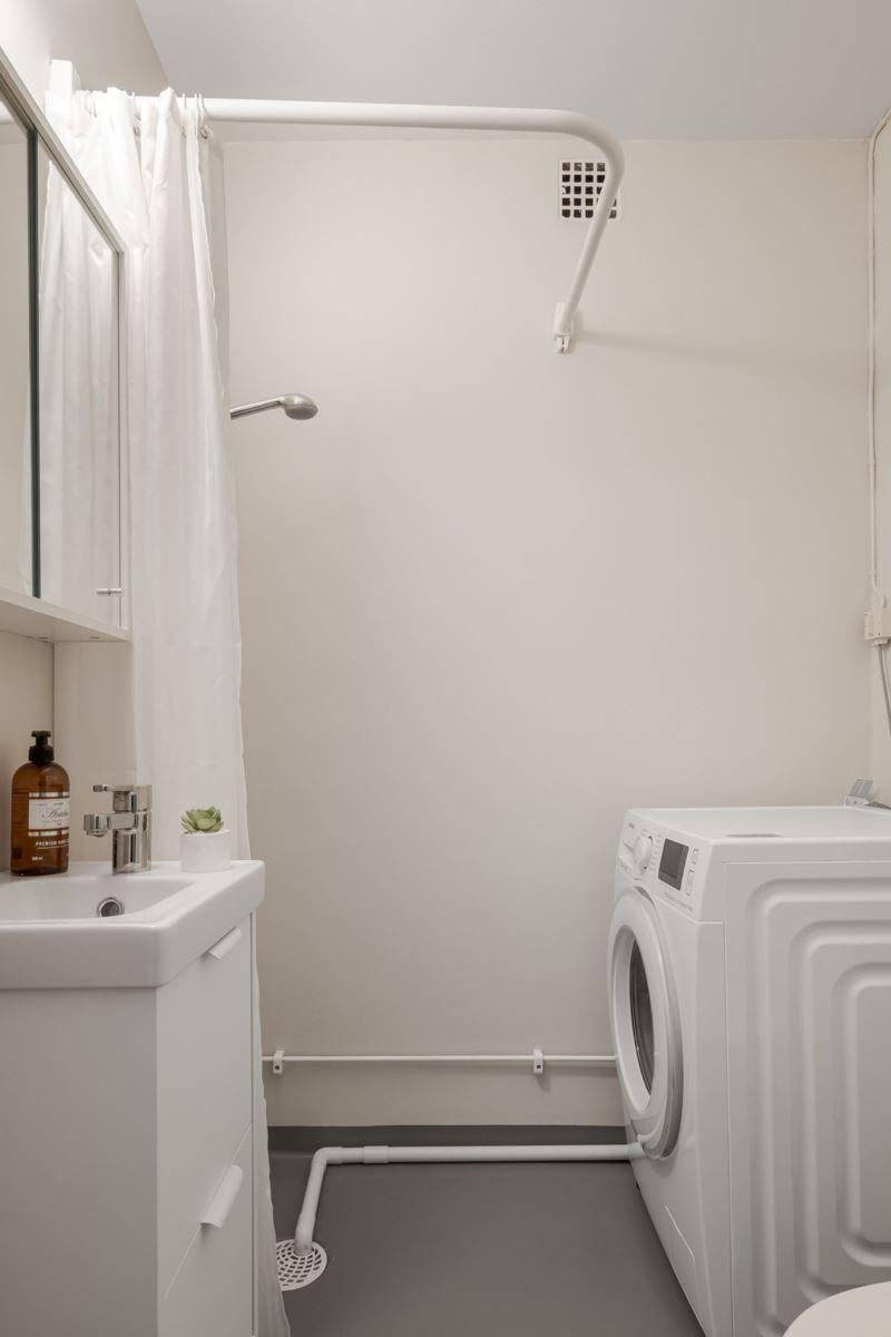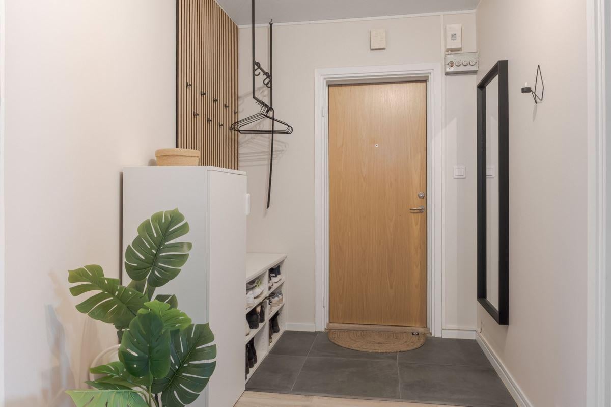 Här möts ljusa ytor, genomtänkt planlösning och en känsla av rymd och plats. Rymlig entréhall med klinker direkt innanför dörren. Det ljusa köket erbjuder både arbetsytor, förvaring och plats för matbord Fönster mot innergården. Två duschrum varav ett utav dessa innehar en tvättmaskin. Detta duschrum har målats samt fått ny toalettstol, tvättställ/kommod samt spegelskåp 2025. Det andra duschrummet renoverades 2021 med ny våtrumsmatta på golv och väggar samt duschplats med glasdörr.