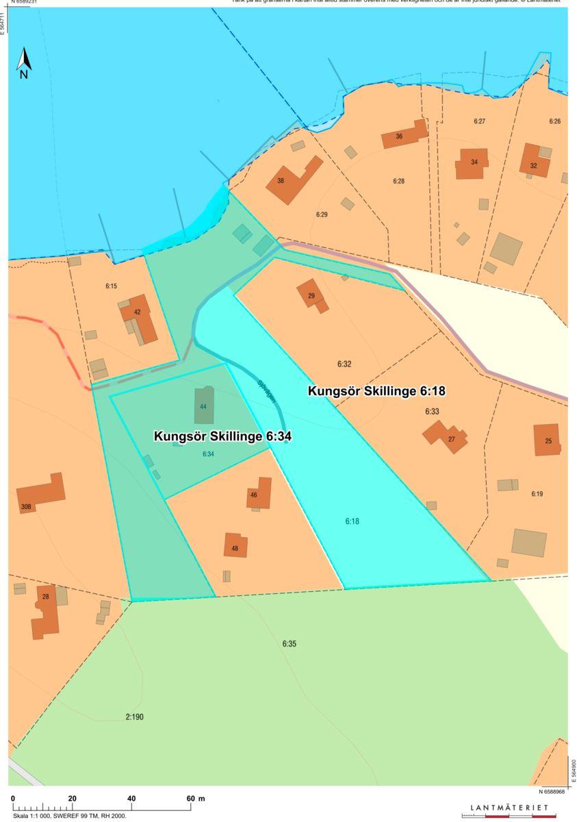 Vid denna försäljning medföljer äganderätten till en 1/4-del i grannfastigheten Skillinge 6:18. Övriga delägare är ägarna till de tre närmast belägna fastigheterna. På denna fastighet, som har areal angiven till 6102 kvadratmeter, finns förutom badstranden, bryggan och gräsytan samt skogsparti direkt väster om den egna tomten två små sjöbodar nere vid stranden samt en liten uteplats framför dessa. Möjlighet att ha båt vid strandkanten.