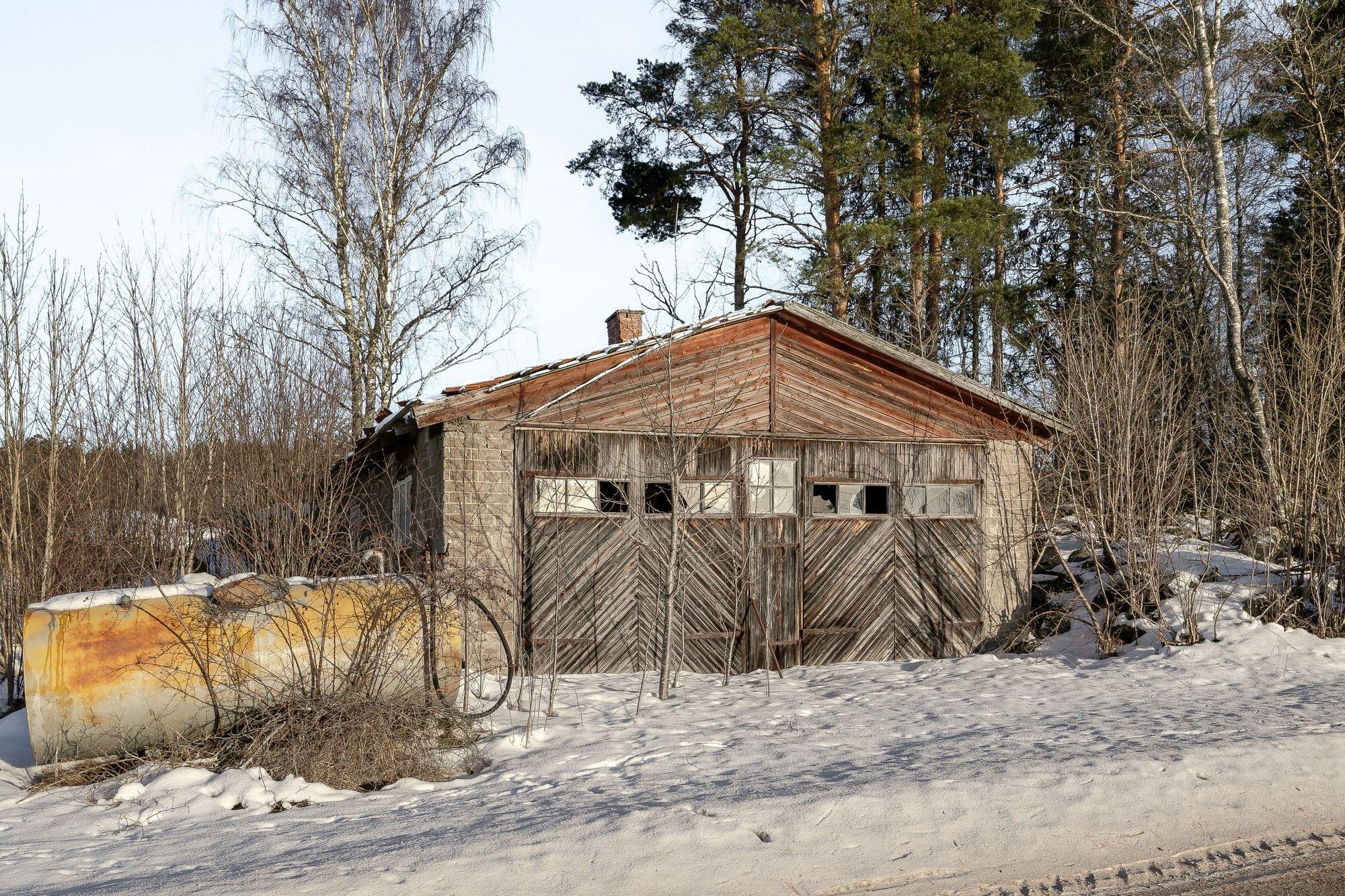 Rejält virkesmagasin om ca 19x19 meter. Rymmer virkesfack. Möjlighet att konvertera till annan inriktning. Trästomme, träfasad och korrugerat plåttak.